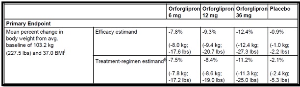 การศึกษานี้บรรลุเป้าประสงค์หลักด้วยการแสดงให้เห็นว่าที่ 72 สัปดาห์ของการศึกษา oral orforglipron ทั้ง 3 ขนาด สามารถลดน้ำหนักลงได้ดีกว่าอย่างมีนัยสำคัญทางสถิติเมื่อเทียบกับ placebo โดยจากการใช้ efficacy estimand พบว่า oral orforglipron ขนาด 6 mg/day, 12 mg/day และ 36 mg/day ลดน้ำหนักลงได้ -7.8% (-8.0 kg), -9.3% (-9.4 kg) และ -12.4% (-12.4 kg) ตามลำดับ จากน้ำหนักโดยเฉลี่ยที่ 103.2 kg (227.5 ปอนด์) เมื่อเริ่มต้นการศึกษา เทียบกับที่ลดลง -0.9% (-1.0 kg) ของกลุ่มคนไข้ที่ได้รับ placebo