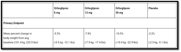 การศึกษานี้บรรลุเป้าประสงค์หลักด้วยการแสดงให้เห็นว่าที่ 72 สัปดาห์ของการศึกษา oral orforglipron ทั้ง 3 ขนาด สามารถลดน้ำหนักลงได้ดีกว่าอย่างมีนัยสำคัญทางสถิติเมื่อเทียบกับ placebo โดยจากการใช้ efficacy estimand พบว่า oral orforglipron ขนาด 6 mg/day, 12 mg/day และ 36 mg/day ลดน้ำหนักลงได้ -7.8% (-8.0 kg), -9.3% (-9.4 kg) และ -12.4% (-12.4 kg) ตามลำดับ จากน้ำหนักโดยเฉลี่ยที่ 103.2 kg (227.5 ปอนด์) เมื่อเริ่มต้นการศึกษา เทียบกับที่ลดลง -0.9% (-1.0 kg) ของกลุ่มคนไข้ที่ได้รับ placebo