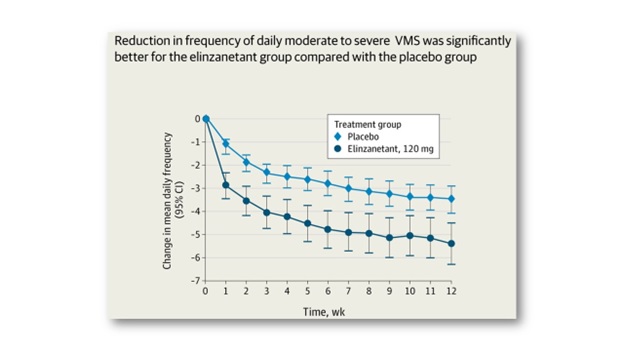 ข้อมูลทางคลินิกที่สำคัญเกี่ยวกับประสิทธิภาพและความปลอดภัยของ elinzanetant ในการบรรเทา vasomotor symptoms ที่เกิดภาวะหมดระดู ที่ Bayer ยื่นให้ FDA พิจารณา ก็คือผลลัพธ์ของ 3 การศึกษาทางคลินิกในระยะที่ 3 (phase III clinical trial) แบบ multicenter, randomized, double-blind, placebo-controlled ซึ่งประกอบด้วย OASIS 1, OASIS 2และ OASIS 3 โดย OASIS 1และ OASIS 2 ทำในสตรีวัยหมดระดูอายุ 40-65 ปี จำนวนเกือบ 800 คน ที่มี moderate to severe vasomotor symptoms เปรียบเทียบระหว่างการให้ elinzanetant 120 mg รับประทานเพียงวันละครั้งเป็นเวลา 26 สัปดาห์ และการให้ matching placebo เป็นเวลา 12 สัปดาห์แล้วตามด้วย elinzanetant 120 mg อีก 14 สัปดาห์ ผลการศึกษาที่รายงานไว้ในวารสารการแพทย์ JAMA (Journal of the American Medical Association) ฉบับเดือนสิงหาคม ปี ค.ศ.2024 พบว่าในทั้ง 2 การศึกษา elinzanetant สามารถลดทั้ง severity และ frequency ของ VMS ลงได้ดีกว่าอย่างมีนัยสำคัญทางสถิติเมื่อเทียบกับ placebo โดยเริ่มเห็นผลในการบรรเทา VMS จากการให้ elinzanetant ได้ตั้งแต่สัปดาห์ที่ 4 ของการศึกษา ขณะเดียวกันพบว่า elinzanetant ยังช่วยลดปัญหาการนอนและเพิ่มคุณภาพชีวิตที่เกี่ยวข้องกับวัยหมดระดู ได้ดีกว่า placebo อีกด้วย และโดยรวมแล้ว elinzanetant ไม่ได้มี safety profile ที่น่ากังวลแต่ประการใด