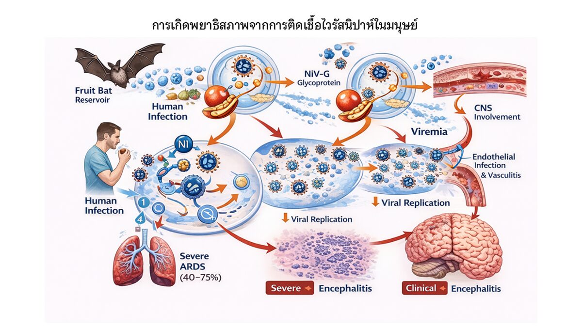 ภาพที่ 1 กลไกการเกิดโรคจากการติดเชื้อไวรัสนิปาห์ในมนุษย์ (Pathogenesis of Nipah Virus Infection in Humans) ภาพนี้แสดงลำดับขั้นของการติดเชื้อและการดำเนินโรคของไวรัสนิปาห์ (Nipah virus; NiV) ในมนุษย์ โดยไวรัสนิปาห์ มีค้างคาวกินผลไม้ (สกุล Pteropus) เป็นแหล่งรังโรคตามธรรมชาติ การติดต่อสู่มนุษย์สามารถเกิดขึ้นได้จากการสัมผัสโดยตรงกับค้างคาวหรือสารคัดหลั่ง การบริโภคอาหารหรือผลไม้ที่ปนเปื้อน โดยหลังจากไวรัสเข้าสู่ร่างกาย ไวรัสนิปาห์จะจับกับเซลล์เจ้าบ้านผ่านโปรตีน G (NiV-G glycoprotein) ซึ่งจับกับตัวรับ ephrin-B2 และ ephrin-B3 ที่พบได้บนเซลล์เยื่อบุทางเดินหายใจ เซลล์บุผนังหลอดเลือด และเซลล์ประสาท จากนั้นโปรตีน F ของไวรัสจะทำหน้าที่ช่วยให้เกิดการหลอมรวมของเยื่อหุ้ม ทำให้ไวรัสสามารถเข้าสู่เซลล์และเริ่มกระบวนการเพิ่มจำนวนของไวรัส (viral replication) ภายในเซลล์บริเวณไซโทพลาสซึม ไวรัสที่เพิ่มจำนวนแล้วจะแพร่กระจายเข้าสู่กระแสเลือด (viremia) ส่งผลให้เกิดการติดเชื้อในเซลล์บุผนังหลอดเลือดทั่วร่างกาย ก่อให้เกิดภาวะหลอดเลือดอักเสบ (vasculitis) ความเสียหายของผนังหลอดเลือด และการเพิ่มความสามารถในการรั่วของหลอดเลือด กระบวนการดังกล่าวนำไปสู่การทำลายกำแพงกั้นระหว่างเลือดกับสมอง (blood–brain barrier; BBB) ทำให้ไวรัสสามารถเข้าสู่ระบบประสาทส่วนกลาง และก่อให้เกิดสมองอักเสบรุนแรง (encephalitis) ขณะเดียวกันการติดเชื้อในระบบทางเดินหายใจและหลอดเลือดปอดส่งผลให้เกิดการบาดเจ็บของเนื้อเยื่อปอดและภาวะหายใจล้มเหลวเฉียบพลัน (acute respiratory distress syndrome; ARDS) การดำเนินโรคที่รุนแรงร่วมกับการอักเสบและความผิดปกติของระบบหลอดเลือด เป็นสาเหตุสำคัญที่ทำให้โรคติดเชื้อไวรัสนิปาห์มีอัตราการเสียชีวิตสูงประมาณร้อยละ 40–75