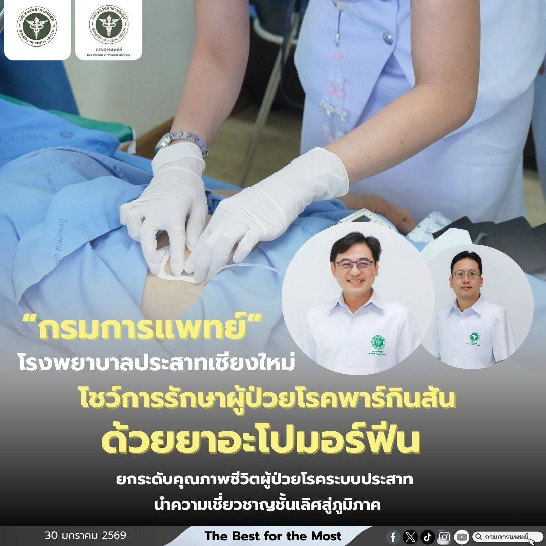 • รพ.ประสาทเชียงใหม่ กรมการแพทย์ โชว์การรักษาผู้ป่วยโรคพาร์กินสันด้วยยาอะโปมอร์ฟีน ยกระดับคุณภาพชีวิตผู้ป่วยโรคระบบประสาท นำความเชี่ยวชาญชั้นเลิศสู่ภูมิภาค