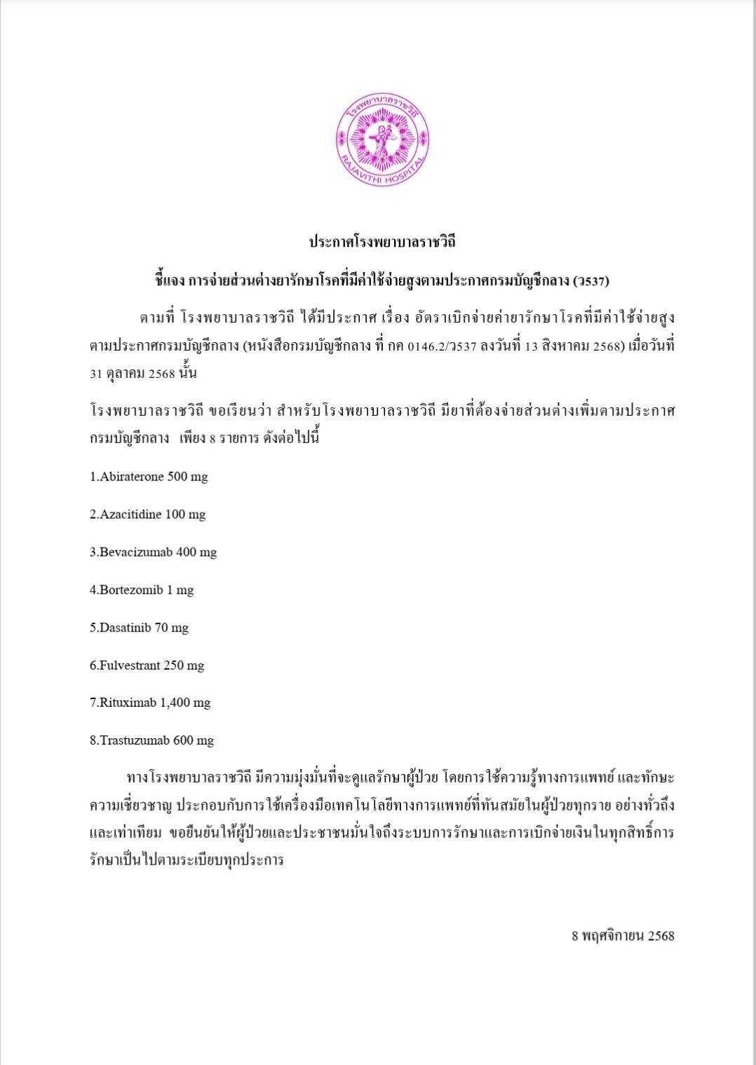 • ประกาศโรงพยาบาลราชวิถี ชี้แจง การจ่ายส่วนต่างยารักษาโรคที่มีค่าใช้จ่ายสูงตามประกาศกรมบัญชีกลาง (ว537)
