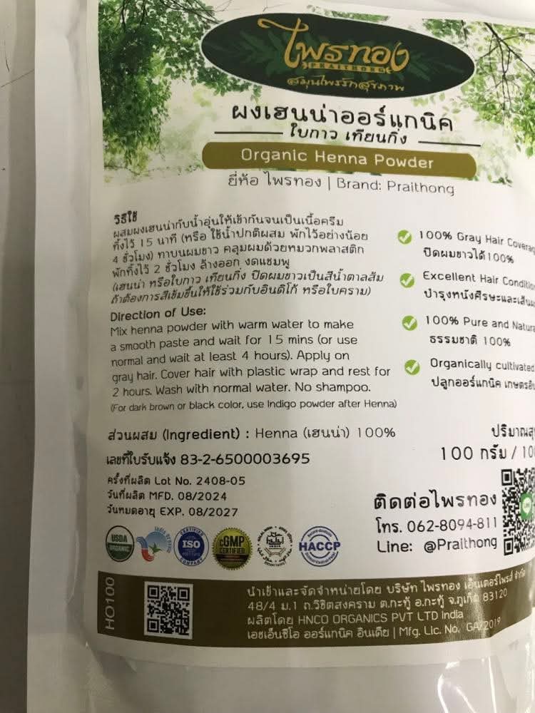 1. | ไพรทอง ผงเฮนน่าออร์แกนิค (PRAITHONG ORGANIC HENNA POWDER) เลขที่ใบรับจดแจ้ง 83-2-6500003695 | นำเข้าและ จัดจำหน่ายโดย บริษัท ไพรทอง เอ็นเตอร์ไพรส์ จำกัด 48/4 ม.1 ถ.วิชิตสงคราม ต.กะทู้ อ.กะทู้ จ.ภูเก็ต 83120