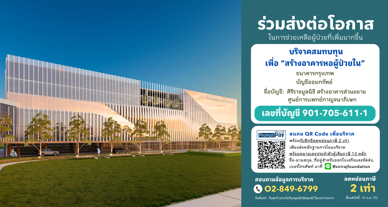 สอบถามข้อมูลบริจาคโทร 02-849-6799 จันทร์ - ศุกร์ เวลา 08:00 - 16:00 น. (ในเวลาราชการ)