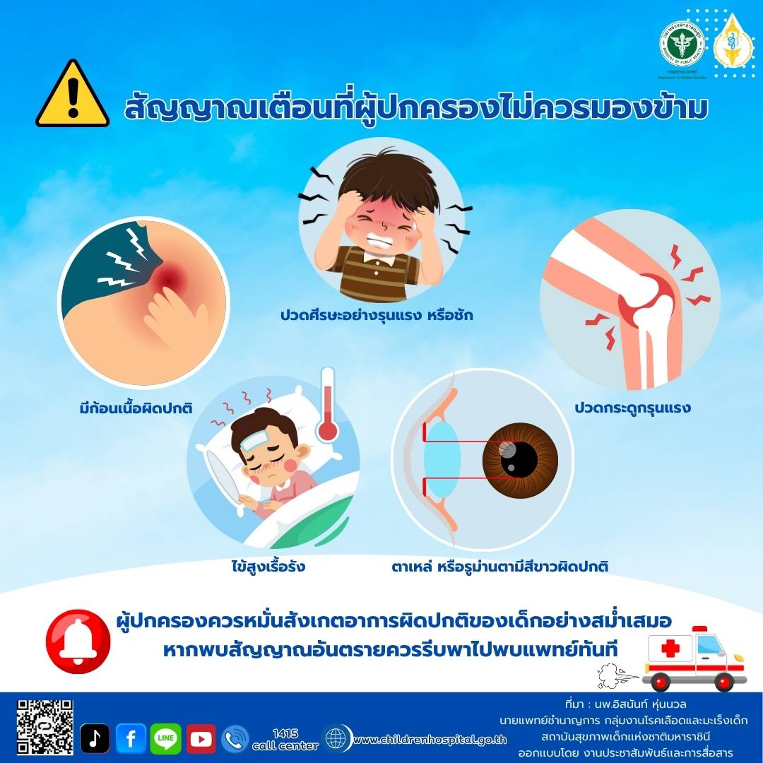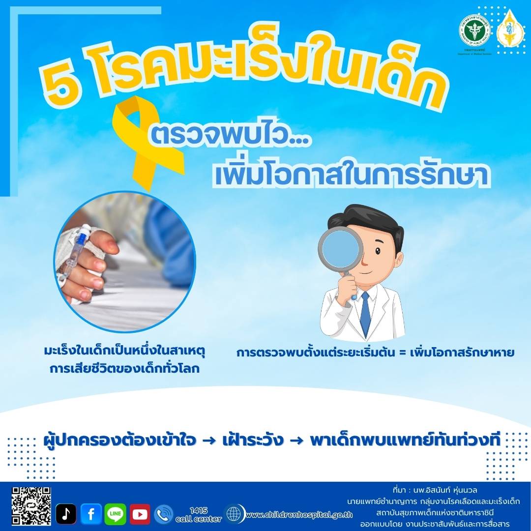 กรมการแพทย์ โดยสถาบันสุขภาพเด็กเด็กแห่งชาติมหาราชินี เผย โรคมะเร็งในเด็กเป็นเรื่องที่สร้างความกังวลให้กับผู้ปกครอง แต่การทำความเข้าใจและเรียนรู้เกี่ยวกับมะเร็งจะช่วยให้สามารถเฝ้าระวังและรับมือได้อย่างทันท่วงที การตรวจพบตั้งแต่เนิ่น ๆ จึงเป็นกุญแจสำคัญที่ช่วยเพิ่มโอกาสในการรักษาให้หายขาดได้