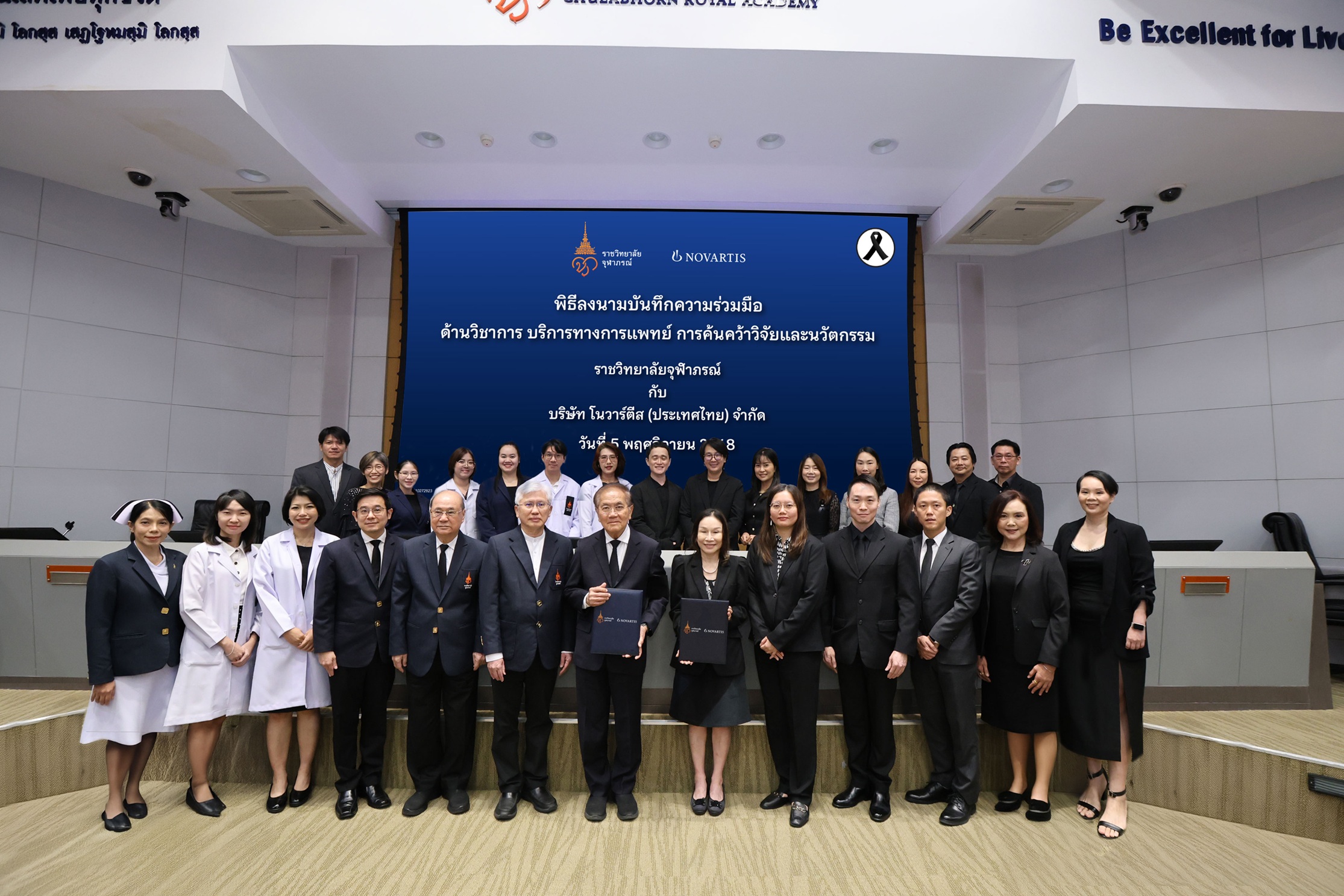 ราชวิทยาลัยจุฬาภรณ์ และ บริษัท โนวาร์ตีส (ประเทศไทย) จำกัด บริษัทยาและเวชภัณฑ์ชั้นนำระดับโลก ร่วมลงนามบันทึกความเข้าใจว่าด้วยความร่วมมือด้านวิชาการ บริการทางการแพทย์ การค้นคว้าวิจัย และนวัตกรรม ณ สำนักงานราชวิทยาลัยจุฬาภรณ์ โดยมีเป้าหมายสำคัญในการแลกเปลี่ยนองค์ความรู้ ขยายผลเครือข่ายวิชาการ และขับเคลื่อนการวิจัยเชิงลึกที่นำไปสู่การยกระดับคุณภาพชีวิตของผู้ป่วยไทยอย่างยั่งยืน ความร่วมมือครั้งนี้มีกรอบระยะเวลา 5 ปี โดยจะเป็นรากฐานสำคัญในการสร้างเครือข่ายองค์ความรู้และนวัตกรรมทางการแพทย์ ที่ผสานความเชี่ยวชาญของสถาบันทางการแพทย์ชั้นนำของประเทศไทยเข้ากับศักยภาพในการค้นคว้า วิจัย และพัฒนานวัตกรรมยาที่ก้าวล้ำของโนวาร์ตีส เพื่อเสริมแกร่งระบบสาธารณสุขไทยสู่ระดับนานาชาติ