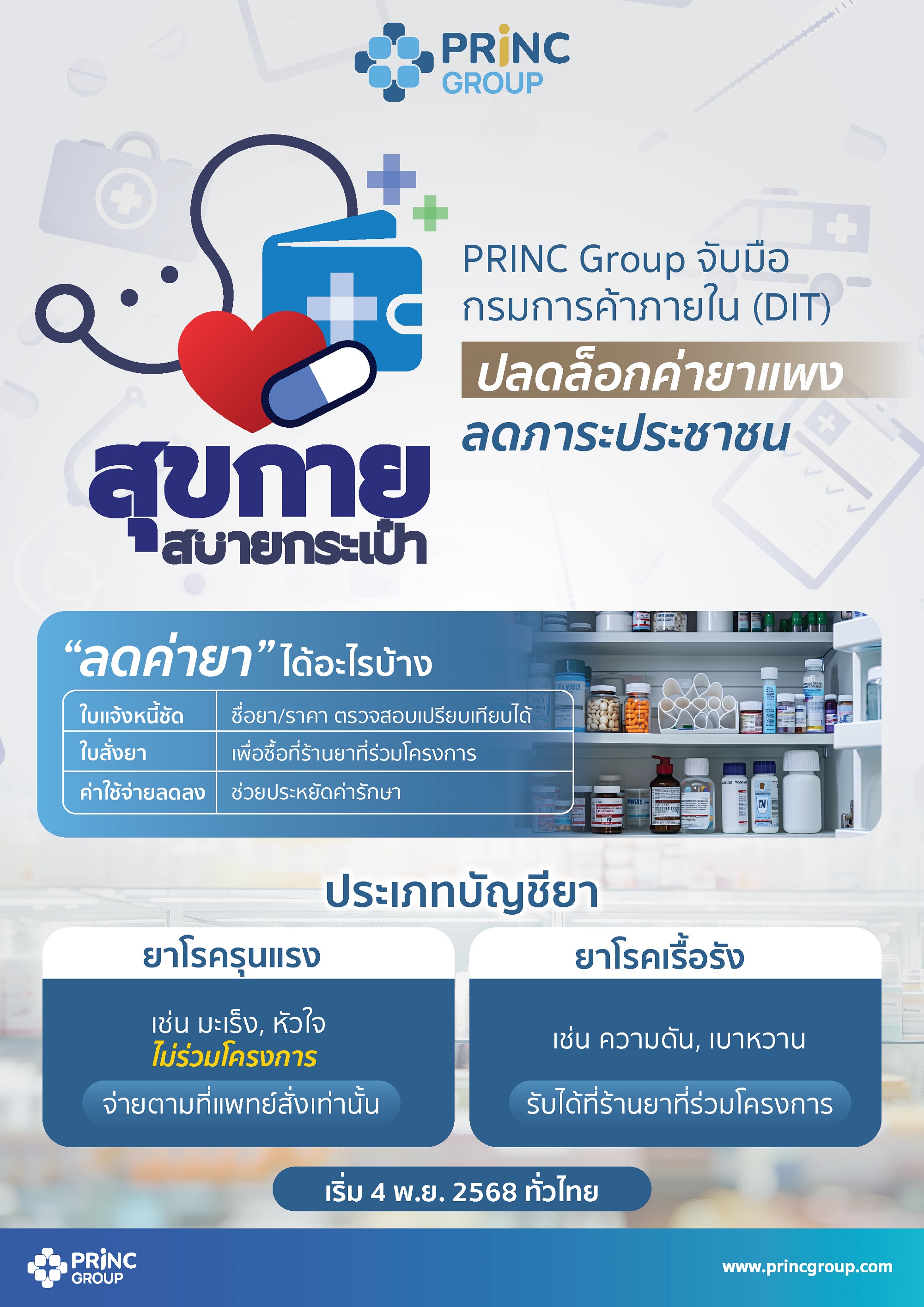 บริษัท พริ้นซิเพิล แคปิตอล จำกัด (มหาชน) หรือ PRINC ผู้ดำเนินธุรกิจโรงพยาบาลและสุขภาพ ในเครือ PRINC Group ประกาศเข้าร่วม โครงการ "สุขกาย สบายกระเป๋า" อย่างเป็นทางการ เพื่อสนับสนุนนโยบายรัฐบาลในการลดภาระค่าใช้จ่ายด้านสุขภาพของประชาชน โรงพยาบาลพริ้นซ์ 16 แห่ง ทั่วประเทศ ขนขบวนบริการสุขภาพราคาประหยัด 62 รายการเข้าร่วมโครงการ มุ่งเน้นการดูแลสุขภาพเชิงป้องกัน (Preventive Care) และลดค่าใช้จ่ายจำเป็นของประชาชน เริ่ม 4 พฤศจิกายน 2568 ถึง 31 มกราคม 2569