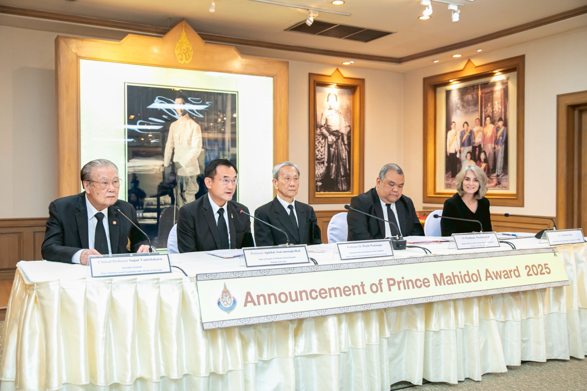 ศาสตราจารย์นายแพทย์อภิชาติ อัศวมงคลกุล คณบดีคณะแพทยศาสตร์ศิริราชพยาบาล มหาวิทยาลัยมหิดล ในฐานะรองประธานมูลนิธิรางวัลสมเด็จเจ้าฟ้ามหิดล ในพระบรมราชูปถัมภ์ ศาสตราจารย์คลินิกเกียรติคุณนายแพทย์สุพัฒน์ วาณิชย์การ เลขาธิการมูลนิธิรางวัลสมเด็จเจ้าฟ้ามหิดล ในพระบรมราชูปถัมภ์ นายปาณิดล ปัจฉิมสวัสดิ์ รองอธิบดีกรมสารนิเทศ กระทรวงการต่างประเทศ ผู้แทนอธิบดีกรมสารนิเทศ กระทรวงการต่างประเทศ ในฐานะประธานคณะอนุกรรมการฝ่ายประชาสัมพันธ์ มูลนิธิรางวัลสมเด็จเจ้าฟ้ามหิดล ในพระบรมราชูปถัมภ์ และศาสตราจารย์เกียรติคุณ ดร. นายแพทย์ประสิทธิ์ วัฒนาภา ประธานคณะกรรมการรางวัลนานาชาติ มูลนิธิรางวัลสมเด็จเจ้าฟ้ามหิดล ในพระบรมราชูปถัมภ์ ได้ร่วมกันแถลงผลการตัดสินผู้ได้รับพระราชทานรางวัลสมเด็จเจ้าฟ้ามหิดลครั้งที่ 34 ประจำปี 2568 ณ ห้องสมเด็จพระบรมราชชนก ตึกสยามินทร์ ชั้น 2 โรงพยาบาลศิริราช