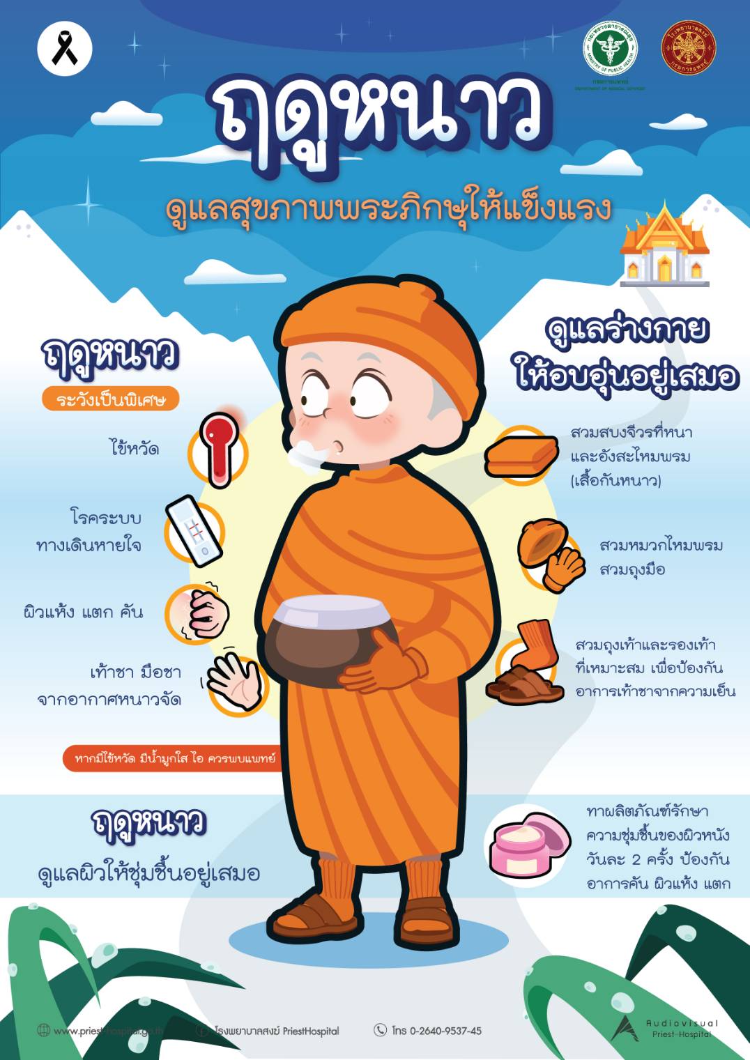 นายแพทย์ไพโรจน์ สุรัตนวนิช รองอธิบดีกรมการแพทย์ กล่าวว่า ขณะนี้สภาพอากาศของประเทศไทย เริ่มมีอากาศหนาวเย็น โดยเฉพาะภาคเหนือและภาคตะวันออกเฉียงเหนือ และอาจส่งผลให้ร่างกายปรับตัวไม่ทัน เกิดการเจ็บป่วยด้วยโรคเกี่ยวกับระบบทางเดินหายใจได้ง่าย เช่น ไข้หวัดใหญ่ ปอดบวม และหลอดลมอักเสบ อีกทั้งในช่วงอากาศหนาวอาจทำให้เกิดโรคติดเชื้อได้ง่าย โดยเฉพาะในกลุ่มผู้สูงอายุ และเด็กเล็ก ซึ่งในกลุ่มพระภิกษุสูงอายุและสามเณร อาจทำให้อาพาธได้ง่ายกว่าปกติ แนะรักษาร่างกายให้อบอุ่นอยู่เสมอ พักอยู่ในที่อบอุ่นหรือที่สามารถป้องกันลมหนาวได้ ฉันอาหารที่ปรุงสุกใหม่ ๆ และมีประโยชน์ให้ครบ 5 หมู่ ฉันน้ำปานะหรือเครื่องดื่มอุ่นๆ จะช่วยปรับสมดุลให้ร่างกาย และหมั่นล้างมือด้วยสบู่ให้สะอาดอยู่เสมอทั้งก่อนและหลังฉันอาหาร เพื่อลดการสะสมของเชื้อโรคที่จะก่อให้เกิดโรคต่าง ๆ ในหน้าหนาว