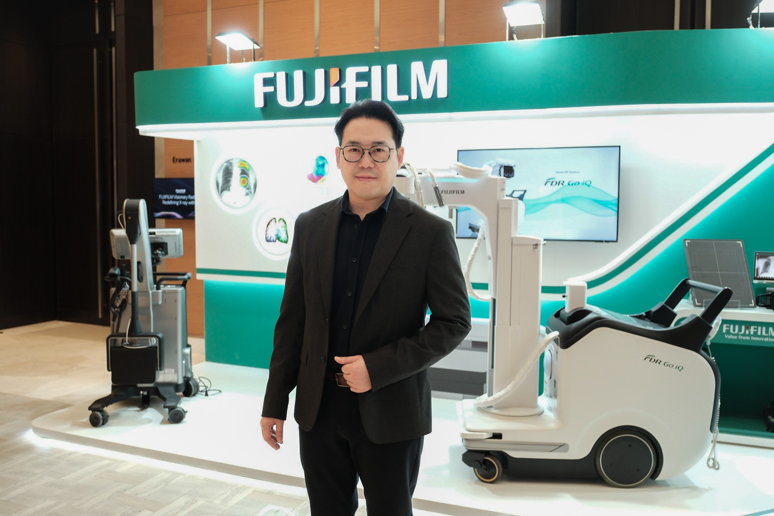 ในโอกาสนี้ ฟูจิฟิล์มยังได้เปิดตัวผลิตภัณฑ์เรือธงสองรุ่นใหม่ในตลาดประเทศไทยเป็นครั้งแรก ได้แก่ FDR Visionary Suite และ FDR Go iQ โดย นายรัชกฤช เต็มบุญศักดิ์ หัวหน้าหน่วยธุรกิจทางการแพทย์และสุขภาพ ดูแลในส่วนเครื่องเอกซเรย์และไอที บริษัท ฟูจิฟิล์ม (ประเทศไทย) จำกัด เผยว่า “FDR Visionary Suite คือระบบเอกซเรย์ดิจิทัลระดับไฮเอนด์ที่ให้ภาพคมชัดด้วยเทคโนโลยีเฉพาะ Irradiated Side Sampling (ISS) ของฟูจิฟิล์ม โดยรุ่นอัปเกรดใหม่มาพร้อมฟีเจอร์กล้อง Live view ที่ช่วยยกระดับการดูแลผู้ป่วยและลดความเสี่ยงในการตรวจ ระบบ Motion Detection และ Last Image View จากฟีดถ่ายทอดสดช่วยลดการถ่ายภาพซ้ำ ขณะที่ระบบจัดท่าอัตโนมัติที่ขับเคลื่อนด้วย AI สำหรับการถ่ายภาพทรวงอก ช่วยเพิ่มความแม่นยำและประสิทธิภาพสำหรับแผนกรังสีวิทยาที่มีผู้ป่วยเป็นจำนวนมาก เทคโนโลยีนี้เข้ามาช่วยลดการถ่ายภาพซ้ำ ย่นระยะเวลาการตรวจ และสร้างประสบการณ์ที่ดีขึ้นสำหรับผู้ป่วยที่อาจกำลังเจ็บปวดหรือรู้สึกกังวล”