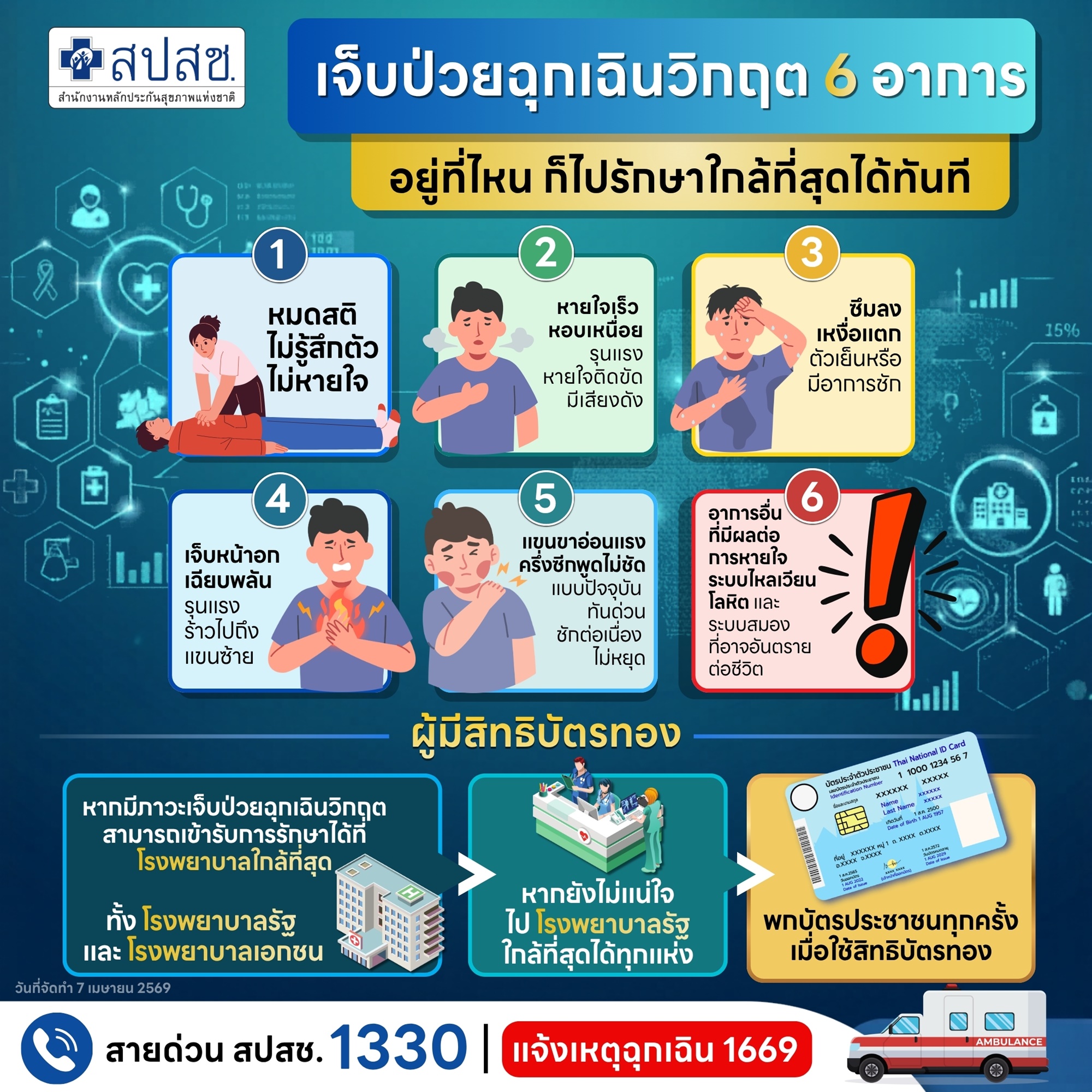 ทั้งนี้ อาการเจ็บป่วยฉุกเฉินวิกฤติถึงแก่ชีวิตที่สามารถสิทธิ UCEP ได้แก่ 1.หมดสติ ไม่รู้สึกตัว เจ็บหน้าอกเฉียบพลัน 2.หายใจเร็ว หอบเหนื่อยรุนแรงหายใจติดขัดมีเสียงดัง 3.ซึมลง เหงื่อแตก ตัวเย็น 4.เจ็บหน้าอกเฉียบพลันรุนแรง 5.แขนขาอ่อนแรงครึ่งซีกพูดไม่ชัดแบบปัจจุบันด่วน หรือชักต่อเนื่องไม่หยุด 6.อาการอื่นที่มีผลต่อการหายใจระบบไหลเวียนโลหิต และระบบสมองที่เป็นอันตรายต่อชีวิต