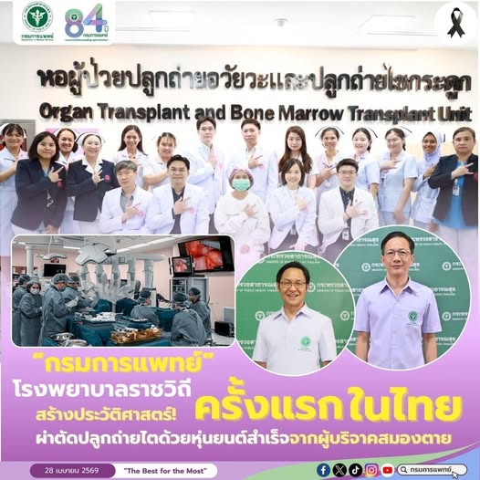 กรมการแพทย์ กระทรวงสาธารณสุข โดยโรงพยาบาลราชวิถี ประสบความสำเร็จในการผ่าตัดปลูกถ่ายไตจากผู้บริจาคสมองตาย ด้วยหุ่นยนต์ช่วยผ่าตัด (Robotic Surgery) เป็นครั้งแรกของประเทศไทย นับเป็นก้าวสำคัญของวงการแพทย์ไทยในการยกระดับการรักษาที่มีความแม่นยำสูง ลดเจ็บ เพิ่มคุณภาพชีวิตผู้ป่วยหลังการผ่าตัด