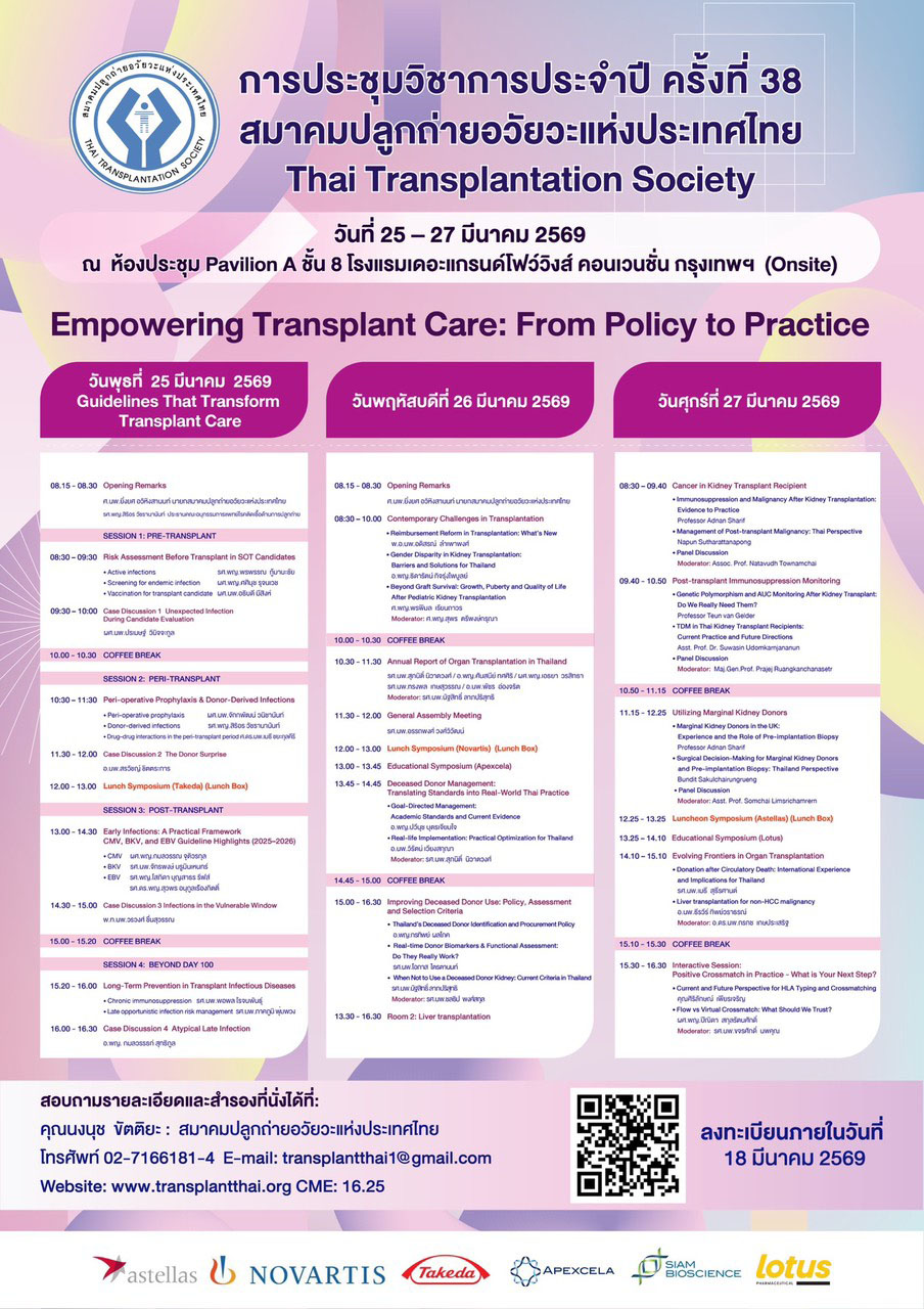 สมาคมปลูกถ่ายอวัยวะแห่งประเทศไทย จัดการประชุมวิชาการประจำปี ครั้งที่ 38 หัวข้อเรื่อง “ Empowering Transplant Care : From Policy to Practice ” วันที่ 25-27 มีนาคม 2569 ณ ห้องประชุม Pavilion A ชั้น 8 โรงแรมเดอะแกรนด์โฟว์วิงส์ คอนเวนชั่น กรุงเทพฯ