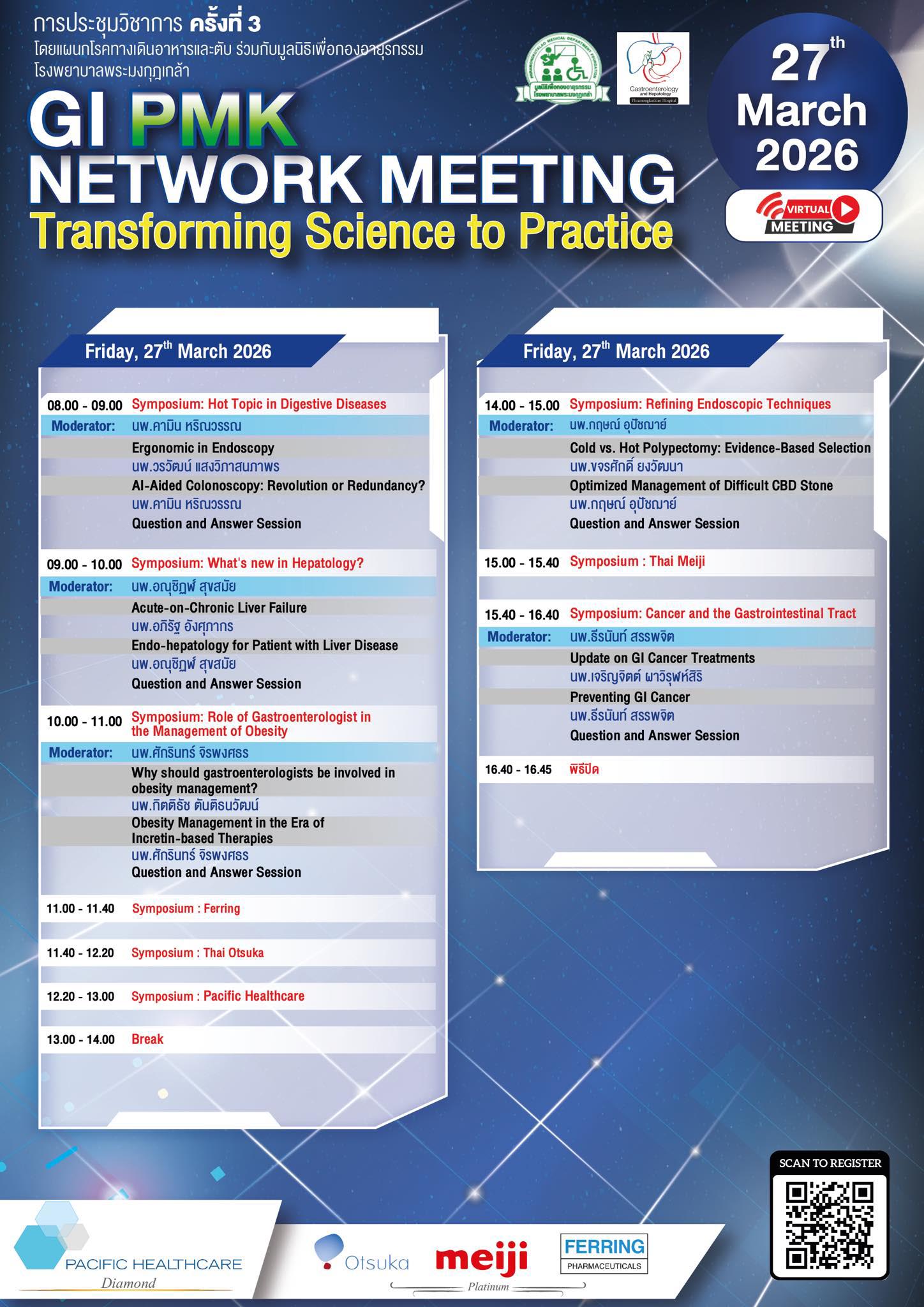 แผนกโรคทางเดินอาหารและตับ ร่วมกับมูลนิธิเพื่อกองอายุรกรรม โรงพยาบาลพระมงกุฎเกล้า จัดการประชุมวิชาการ GI PMK Network Meeting ครั้งที่ 3 “ Transforming Science to Practice ” วันศุกร์ที่ 27 มีนาคม 2569 รูปแบบ Virtual Meeting