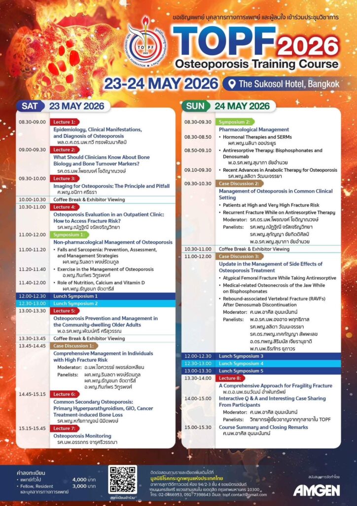 ขอเชิญแพทย์ บุคลากรทางการแพทย์ และผู้สนใจเข้าร่วมประชุมวิชาการ TOPF 2026 Osteoporosis Training Course วันที่ 23-24 พ.ค.69 ณ โรงแรมสุโกศล กรุงเทพฯ