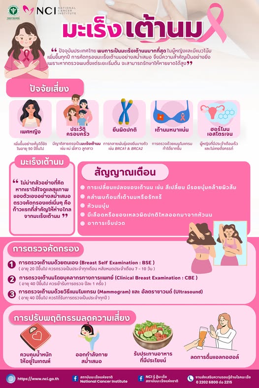 เรืออากาศเอกนายแพทย์สมชาย ธนะสิทธิชัย ผู้อำนวยการสถาบันมะเร็งแห่งชาติ กล่าวว่า สุภาพสตรีทุกท่านควรหมั่นสังเกตตนเองเพื่อหาความผิดปกติของเต้านมค้นหาสัญญาณเตือนที่ต้องรีบปรึกษาแพทย์ การตรวจเต้านมด้วยตัวเองเป็นประจำ (Breast Self-Examination: BSE) จะช่วยให้สังเกตเห็นการเปลี่ยนแปลงที่ผิดปกติได้ตั้งแต่เนิ่น ๆ หากพบอาการเหล่านี้ควรรีบปรึกษาแพทย์ทันที อาทิ คลำพบก้อนหรือความแข็งที่ผิดปกติที่เต้านมหรือบริเวณรักแร้ การเปลี่ยนแปลงของผิวเต้านม เช่น สีผิวที่เปลี่ยนไป หรือมีรอยบุ๋มคล้ายผิวส้ม มีอาการหัวนมบุ๋ม หรือมีการเปลี่ยนแปลงรูปร่างของหัวนม มีสารคัดหลั่ง หรือมีเลือด/ของเหลวผิดปกติไหลออกมาจากหัวนม อาการเจ็บปวดเต้านมที่ไม่หายไปหรือเป็นต่อเนื่อง