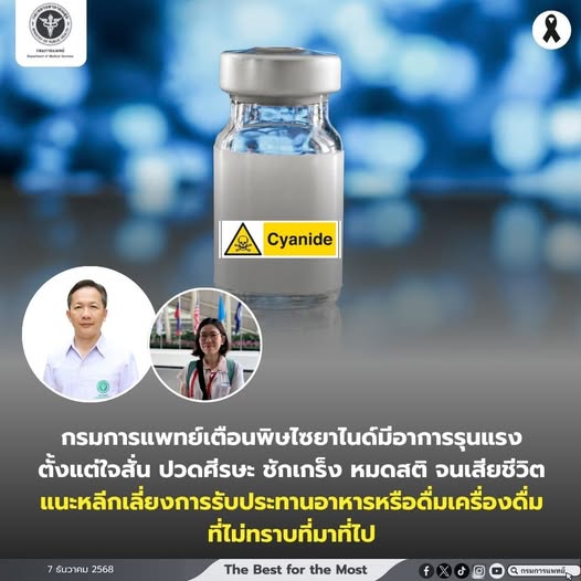 กรมการแพทย์เตือนพิษไซยาไนด์มีอาการรุนแรงตั้งแต่ใจสั่น ปวดศีรษะ ชักเกร็ง หมดสติ จนเสียชีวิต แนะหลีกเลี่ยงการรับประทานอาหารหรือดื่มเครื่องดื่ม ที่ไม่ทราบที่มาที่ไป