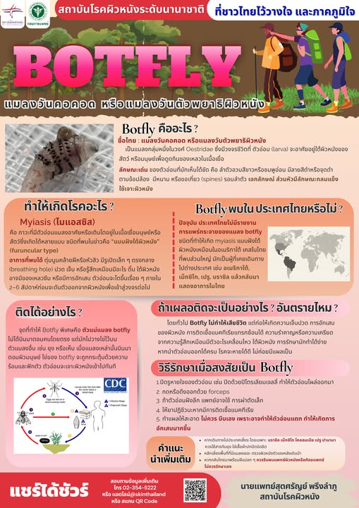 สถาบันโรคผิวหนัง กรมการแพทย์กล่าว จากกระแสพบตัวอ่อนแมลงลักษณะคล้ายหนอนสีขาวอมชมพูถูกแชร์ในโลกออนไลน์ ทำให้หลายคนเกิดความกังวลว่าสิ่งนี้คืออะไรและอันตรายหรือไม่ ซึ่งข้อมูลที่ถูกต้องคือ ตัวอ่อนดังกล่าวมีลักษณะคล้าย Botfly เป็นแมลงในกลุ่ม Oestridae ในข่าวมีลักษณะเข้ากันได้กับสายพันธุ์ Dermatobia hominis ซึ่งพบมากในอเมริกากลาง–อเมริกาใต้ ไม่ใช่แมลงที่พบตามธรรมชาติในประเทศไทย