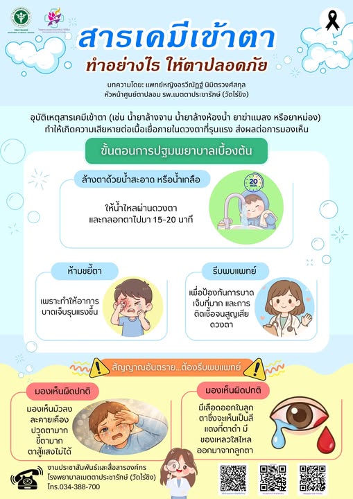 นายแพทย์กิตติวัฒน์ มะโนจันทร์ ผู้อำนวยการโรงพยาบาลเมตตาประชารักษ์ (วัดไร่ขิง) กล่าวว่า อุบัติเหตุทางตาเกิดได้หลายรูปแบบไม่ว่าจะเป็นจากการขับขี่ การทำงาน การเล่นกีฬาตลอดจนอุบัติเหตุสารเคมีกระเด็นเข้าตา เช่น น้ำยาล้างจาน น้ำยาล้างห้องน้ำ ยาฆ่าแมลง กรดที่ใช้เติมแบตเตอรี่รถยนต์ กรดในโรงงานอุตสาหกรรม ยาฆ่าแมลงหรือแม้กระทั่งกาวร้อน หรือยาหม่อง ยาน้ำนวดแก้ปวด โดยเฉพาะคนสูงอายุที่มีปัญหาโรคตา หรือต้องมีการหยอดยาอยู่เป็นประจำอาจหยิบผิดขวดทำให้หยอดยาผิดจึงต้องมีการป้องกันและระวังมากขึ้น เพราะหากสารเคมีเข้าสู่ตาอาจเกาะอยู่ที่ผิวนอกกระจกตา เยื่อบุตาด้านนอก หรือแทรกซึมเข้าไปชั้นในของเนื้อกระจกตาและลูกตาได้ ทำให้เกิดความเสียหายต่อเนื้อเยื่อภายในดวงตาที่รุนแรง ส่งผลต่อการมองเห็น แนะวิธีป้องกันก่อนสายเกินแก้