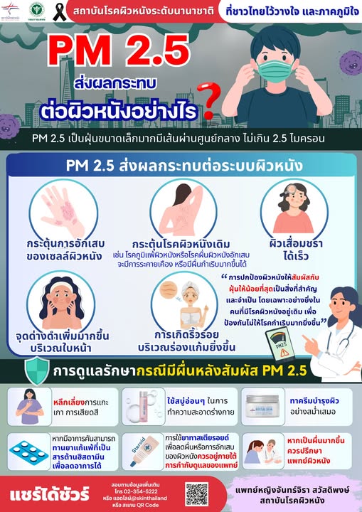 แพทย์หญิงจันทร์จิรา สวัสดิพงษ์ นายแพทย์ชำนาญการพิเศษ สถาบันโรคผิวหนัง กล่าวเพิ่มเติม PM 2.5 ไม่เพียงแค่กระทบต่อระบบทางเดินหายใจแต่ยังเป็นภัยเงียบที่ทำร้ายผิวหนัง เนื่องจากฝุ่นละอองขนาดเล็กสามารถแทรกซึมสู่ผิว ก่อให้เกิดการอักเสบ ผื่นคัน รวมทั้งอาจกระตุ้นให้โรคผิวหนังที่มีอยู่เดิมกำเริบได้ การปกป้องผิวและหลีกเลี่ยงการสัมผัสกับ PM 2.5 โดยตรงจึงเป็นสิ่งสำคัญ ในส่วนของการดูแลรักษาเบื้องต้นกรณีมีผื่นคันหลังการสัมผัสฝุ่น PM 2.5 สามารถทำได้โดยหลีกเลี่ยงการแกะเกา การเสียดสี และการระคายเคืองต่างๆ ซึ่งเป็นสาเหตุที่ทำให้เป็นผื่นมากยิ่งขึ้น ควรใช้สบู่อ่อนๆ ในการ ทำความสะอาดร่างกาย ทาครีมบำรุงผิวอย่างสม่ำเสมอ หากมีอาการคันสามารถทานยาแก้แพ้ที่เป็นสารต้านฮิสตามีน เพื่อลดอาการได้ การซื้อยาทาสเตียรอยด์เพื่อลดผื่นหรือการอักเสบของผิวหนังควรอยู่ภายใต้การกำกับดูแลของแพทย์หรือเภสัชกร อย่างไรก็ตามถ้าผื่นเป็นมากขึ้นควรปรึกษาแพทย์ผู้เชี่ยวชาญเพื่อรับการรักษาที่ถูกต้องและเหมาะสมต่อไป