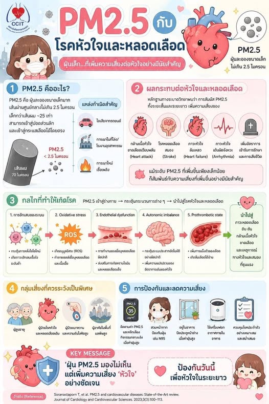 นายแพทย์ธนินทร์ เวชชาภินันท์ รองอธิบดีกรมการแพทย์ เปิดเผยว่า มลพิษทางอากาศจากฝุ่น PM2.5 ไม่ได้ส่งผลกระทบเพียงแค่ระบบทางเดินหายใจเท่านั้น เพราะฝุ่นละอองขนาดเล็กไม่เกิน 2.5 ไมครอนนี้ คือปัจจัยเสี่ยงสำคัญที่กระตุ้นให้เกิดโรคไม่ติดต่อเรื้อรัง โดยเฉพาะกลุ่มโรคหัวใจและหลอดเลือดอย่างมีนัยสำคัญ ไม่ว่าจะเป็นการสัมผัสฝุ่นในระยะสั้นหรือระยะยาว ต่างเพิ่มความเสี่ยงต่อการเกิดภาวะกล้ามเนื้อหัวใจขาดเลือดเฉียบพลัน โรคหลอดเลือดสมอง ภาวะหัวใจล้มเหลว และหัวใจเต้นผิดจังหวะ