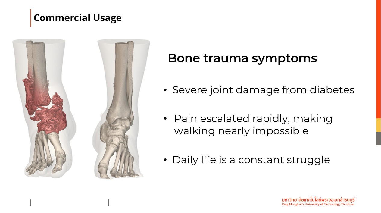 ข้อเท้าเสื่อมถือเป็นหนึ่งในปัญหาสุขภาพที่ซับซ้อนและส่งผลกระทบต่อคุณภาพชีวิตของผู้ป่วยอย่างมาก โดยมีสาเหตุสำคัญจากอุบัติเหตุโรคเบาหวาน และการติดเชื้อในข้อ รวมถึงภาวะโรคเรื้อรังต่างๆ ที่ส่งผลกระทบต่อข้อต่อโดยตรง ซึ่งล้วนก่อให้เกิดการทำลายและสูญเสียเนื้อกระดูกในข้อเท้าอย่างรุนแรง ภาวะนี้ทำให้ผู้ป่วยต้องเผชิญกับความเจ็บปวด การเดินลำบาก และข้อจำกัดในการใช้ชีวิตประจำวัน ในปัจจุบันผู้ป่วยต้องเข้ารับการผ่าตัดเพื่อกำจัดกระดูกที่เสียหาย และใช้ bone graft มาทดแทนโพรงกระดูกที่สูญเสียไป ทว่าแนวทางการรักษาในปัจจุบันยังเต็มไปด้วยข้อจำกัด การใช้วัสดุแบบเดิมยังขาดความสามารถในการออกแบบเฉพาะบุคคล ซึ่งหมายความว่าวัสดุเหล่านี้มักต้องอาศัยการปรับแต่งด้วยมือเพื่อให้เข้ากับความบกพร่องของกระดูกแต่ละราย ส่งผลให้เกิดความเสี่ยงของการยึดติดที่ไม่เหมาะสม และกระทบต่อความมั่นคงของกระดูกในระยะยาว นอกจากนี้ การใช้กระดูกบริจาค (allograft) ยังมีข้อจำกัดสำคัญ เช่น ความเสี่ยงในการถ่ายทอดโรค การตอบสนองทางภูมิคุ้มกัน และข้อจำกัดด้านปริมาณ ปัญหาเหล่านี้ไม่เพียงทำให้ผู้ป่วยบางรายต้องเข้ารับการผ่าตัดซ้ำ แต่อาจนำไปสู่การสูญเสียอวัยวะถาวร และตอกย้ำถึงความจำเป็นเร่งด่วนในการพัฒนาวิธีการรักษาและวัสดุทดแทนกระดูกที่มีประสิทธิภาพมากขึ้น