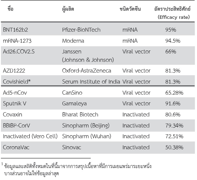 ตารางข้างล่างแสดงภาพรวมของวัคซีนทั้ง 13 รายการ แยกตามชนิดการทำงาน รวมทั้งประสิทธิศักย์ (efficacy) หรือการให้ผลสำเร็จของวัคซีน