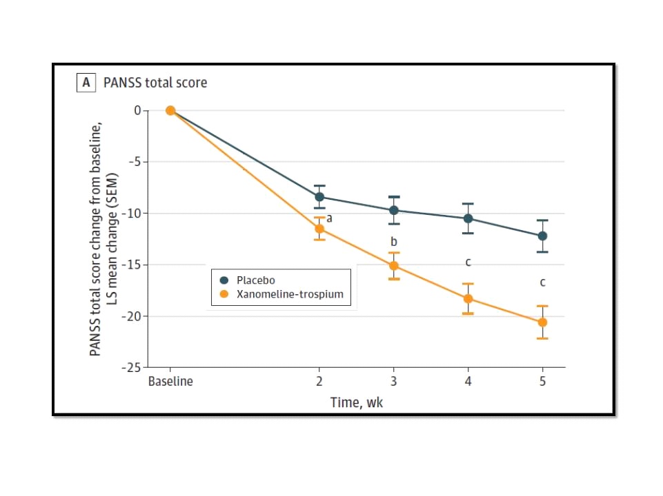ผลการศึกษาของ EMERGENT-2 ซึ่งได้รับการตีพิมพ์ในวารสาร Lancet ฉบับเดือนมกราคม ปี ค.ศ.2024 พบว่าที่ 5 สัปดาห์ของการศึกษา กลุ่มผู้ป่วย schizophrenia จำนวน 126 คน ที่ถูกสุ่มให้ได้รับ Cobenfy วันละ 2 ครั้ง มี mean change ของ PANSS total score ลดลง 21.2 points จาก PANSS total score เมื่อเริ่มต้นการศึกษาที่ 98.3 points เทียบกับที่ลดลง 11.6 points ของกลุ่มผู้ป่วย schizophrenia ที่ได้รับ placebo ซึ่งแตกต่างกันอย่างมีนัยสำคัญทางสถิติ (p<0•0001) ขณะเดียวกันในเรื่องของความปลอดภัยพบว่ากลุ่มผู้ป่วยที่ได้รับ Cobenfy มี treatment-emergent adverse event rates ของ extrapyramidal motor symptoms อยู่ที่ 0% เทียบกับ 0% ของกลุ่มผู้ป่วยที่ได้รับ placebo, มี akathisia 1% เทียบกับ 1% เช่นกันของกลุ่มที่ได้รับ placebo, มี weight gain 0% เทียบกับ 1% และมี somnolence 5% เทียบกับ 4% ของกลุ่มที่ได้รับ placebo โดยมี adverse event-related discontinuation rates อยู่ที่ 7% ในกลุ่มที่ได้รับ Cobenfy เทียบกับ 6% ของกลุ่มที่ได้รับ placebo ดังนั้น จึงสรุปว่า Cobenfy มีประสิทธิภาพในการลด positive และ negative symptoms ของ schizophrenia และ Cobenfy ก็ค่อนข้างมีความปลอดภัยสูงด้วย
