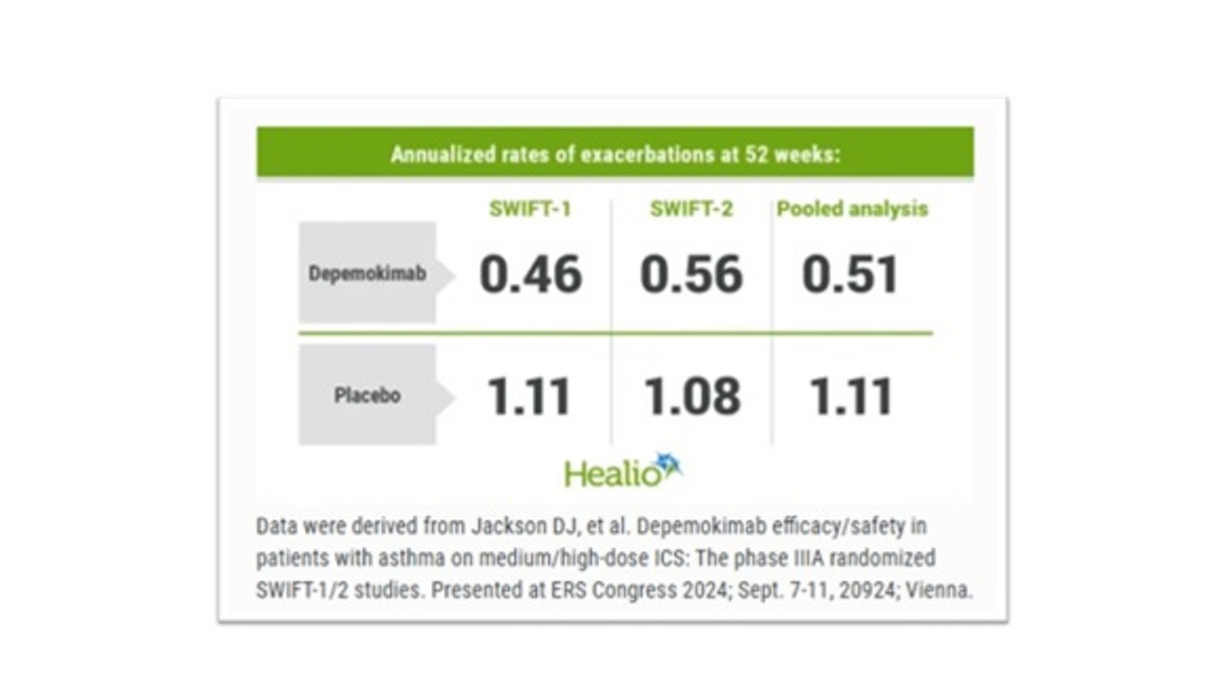ผลการศึกษาที่เป็น full analysis ของ SWIFT-1 และ SWIFT-2 (คนไข้ 502 คน ถูกสุ่มให้ได้รับ depemokimab และ 260 คนถูกสุ่มให้ได้รับ placebo) พบว่าใน SWIFT-1 มี annualized rate of exacerbations อยู่ที่ 0.46 [95% confidence interval [CI], 0.36 to 0.58] สำหรับกลุ่มคนไข้ที่ได้รับ depemokimab เทียบกับ 1.11 (95% CI, 0.86 to 1.43) ของกลุ่มคนไข้ที่ได้รับ placebo ซึ่งมีความแตกต่างกันอย่างมีนัยสำคัญทางสถิติ (rate ratio, 0.42; 95% CI, 0.30 to 0.59; P<0.001)