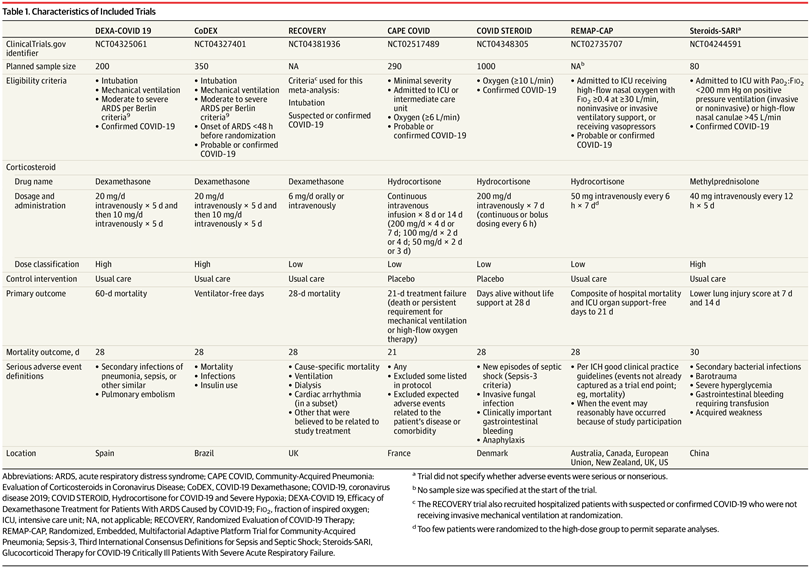 การวิเคราะห์เชิงอภิมานนี้ครอบคลุมการศึกษาหลายชิ้น เพื่อประเมินการออกฤทธิ์ของยา corticosteroid ในผู้ป่วยหนัก ซึ่งได้รับการยืนยันว่าเป็น COVID-10 หรือสงสัยว่าเป็น COVID-19 ค่ามัธยฐานของอายุเท่ากับ 60 ปี และผู้เข้าร่วมการศึกษาร้อยละ 29 เป็นผู้หญิง