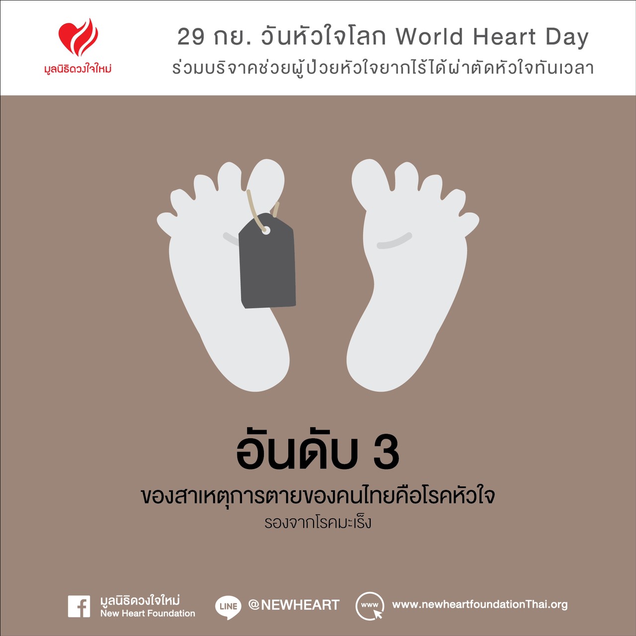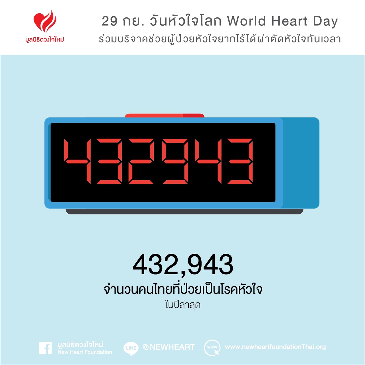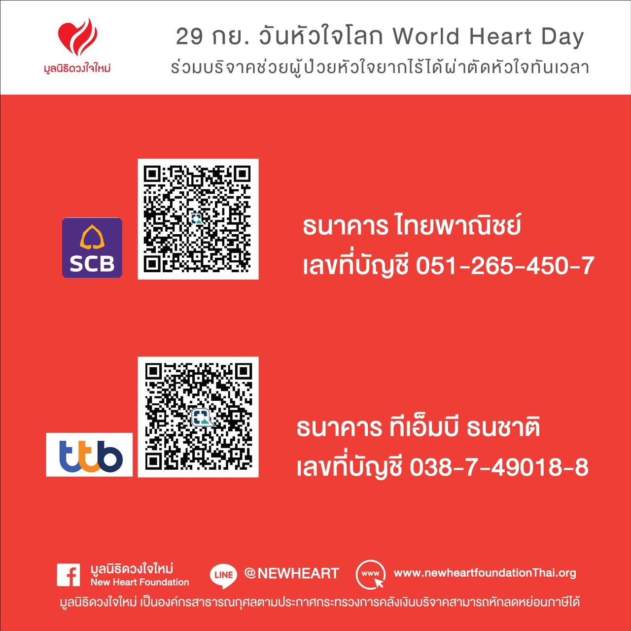 ยังมีอีกหลายชีวิตที่กำลังรอการเดิมพันเพียงลำพัง มาร่วมกันสร้างกุศลต่อชีวิตเพื่อนมนุษย์ หยุดเวลาคร่าชีวิต ด้วยการเป็นผู้ให้ ช่วยผู้ป่วยโรคหัวใจผู้ยากไร้ ได้ผ่าตัวหัวใจทันเวลา และมาร่วมสร้างกุศลด้วยการต่อชีวิตเพื่อนมนุษย์เนื่องในวันหัวใจโลก 29 กันยายน กับมูลนิธิดวงใจใหม่ ได้ที่บัญชีออมทรัพย์ ชื่อบัญชี “มูลนิธิดวงใจใหม่” ธ.ไทยพาณิชย์ จำกัด สาขาโรงพยาบาลราชวิถี บัญชีเลขที่ 051-2-65450-7 หรือโทร. 081 915 3651 เพื่อช่วยผู้ช่วยยากไร้ ให้ได้ผ่าตัดหัวใจ เพราะไม่รู้ว่ากว่าจะได้คิว...จะยังมีลมหายใจอยู่ไหม?