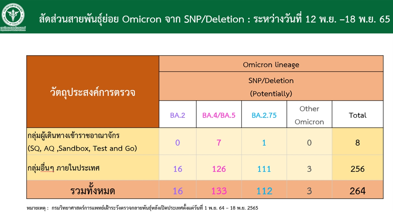 ข้อมูลล่าสุดที่กรมวิทยาศาสตร์การแพทย์ ร่วมกับเครือข่ายตรวจเฝ้าระวังติดตามการกลายพันธุ์ของเชื้อโควิด 19 ในประเทศ และติดตามสายพันธุ์น่ากังวลที่อาจพบจากผู้เดินทางเข้าประเทศ โดยในช่วงสัปดาห์ที่ผ่านมาระหว่างวันที่ 12-18 พฤศจิกายน 2565 ผลการตรวจเฝ้าระวังแบบ SNP/Deletion ด้วยวิธี RT-PCR จำนวน 246 ราย พบว่า ในภาพรวมพบสัดส่วนของ BA.2.75 เพิ่มขึ้นเป็น 42.9% จากสัปดาห์ก่อนที่มีสัดส่วน 23.6% และเมื่อแยกตามกลุ่มพบว่าส่วนใหญ่มีแนวโน้มเพิ่มขึ้นในกลุ่มผู้ติดเชื้อในประเทศจาก 23.2% เป็น 43.9% โดยเฉพาะพื้นที่เขตสุขภาพที่ 2, 6, 11 และ 12 ที่พบสัดส่วนมากกว่าครึ่งเป็นสายพันธุ์ BA.2.75