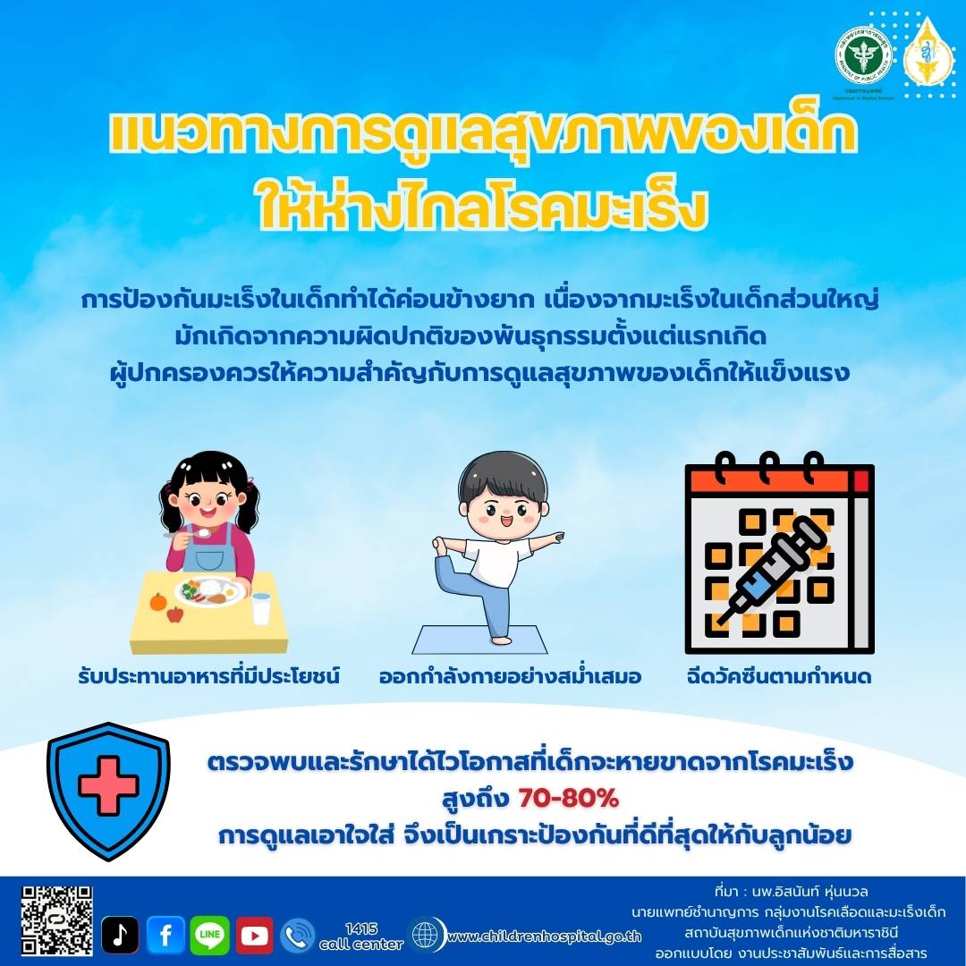 กรมการแพทย์ โดยสถาบันสุขภาพเด็กเด็กแห่งชาติมหาราชินี เผย โรคมะเร็งในเด็กเป็นเรื่องที่สร้างความกังวลให้กับผู้ปกครอง แต่การทำความเข้าใจและเรียนรู้เกี่ยวกับมะเร็งจะช่วยให้สามารถเฝ้าระวังและรับมือได้อย่างทันท่วงที การตรวจพบตั้งแต่เนิ่น ๆ จึงเป็นกุญแจสำคัญที่ช่วยเพิ่มโอกาสในการรักษาให้หายขาดได้