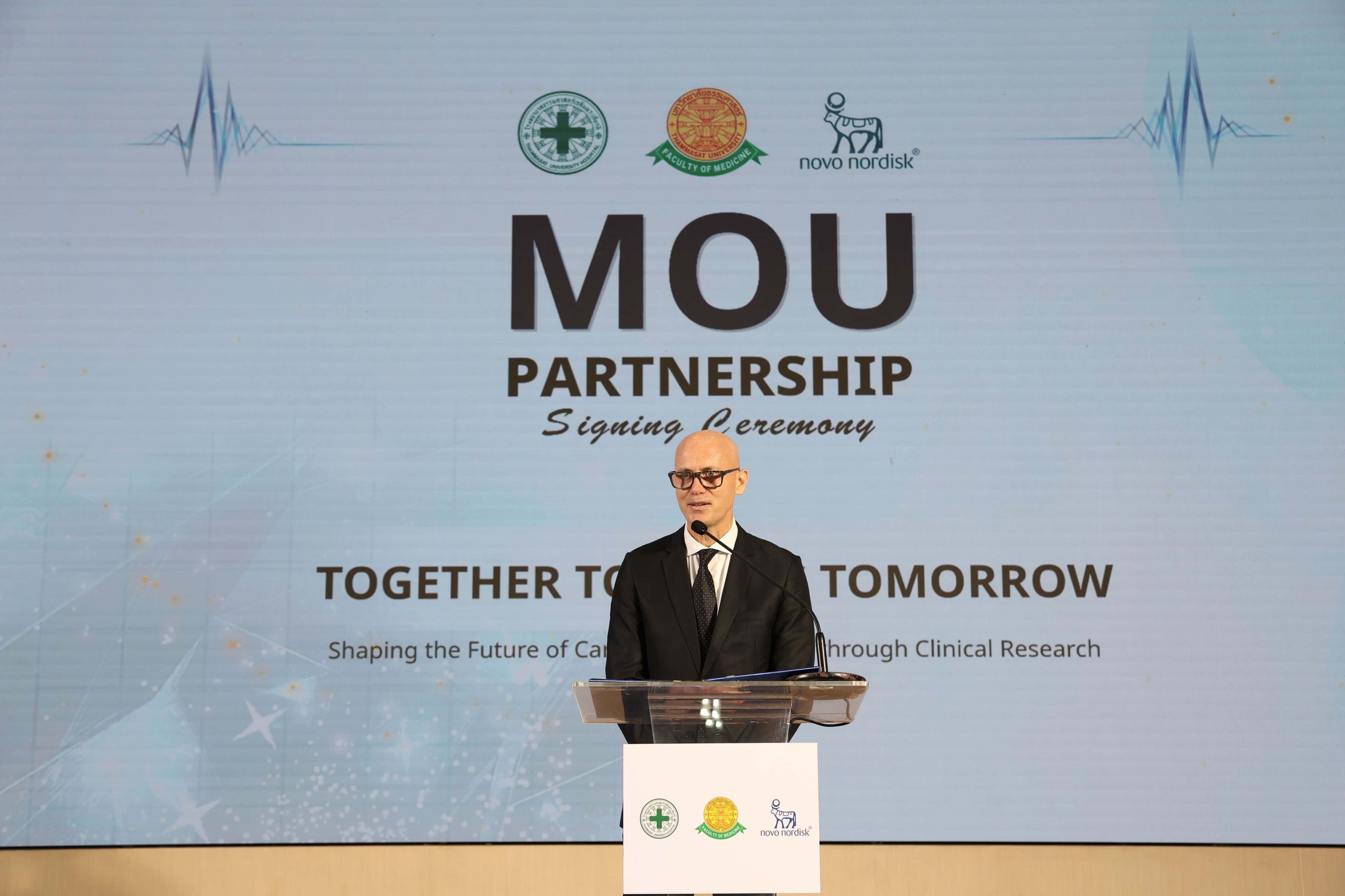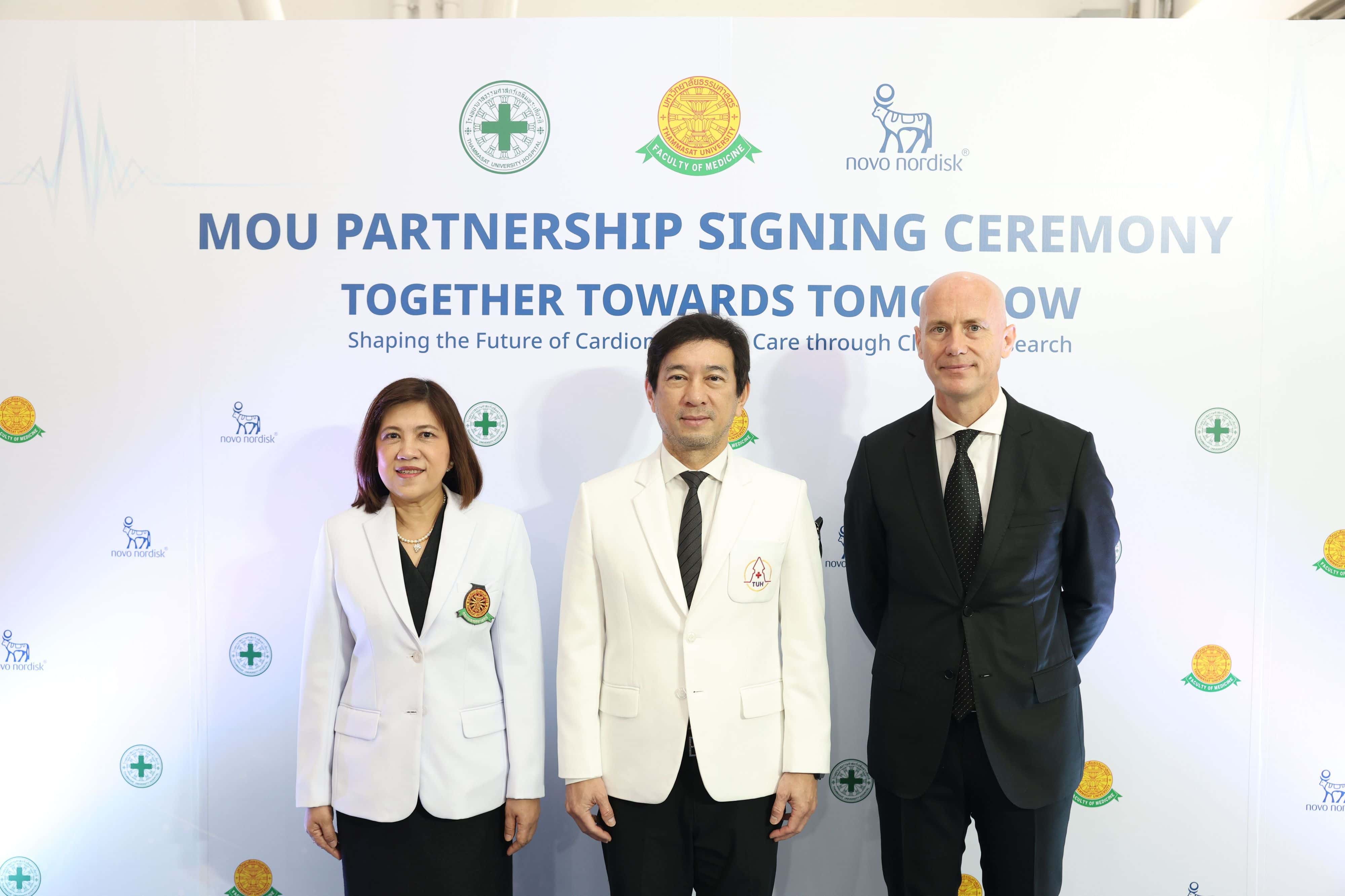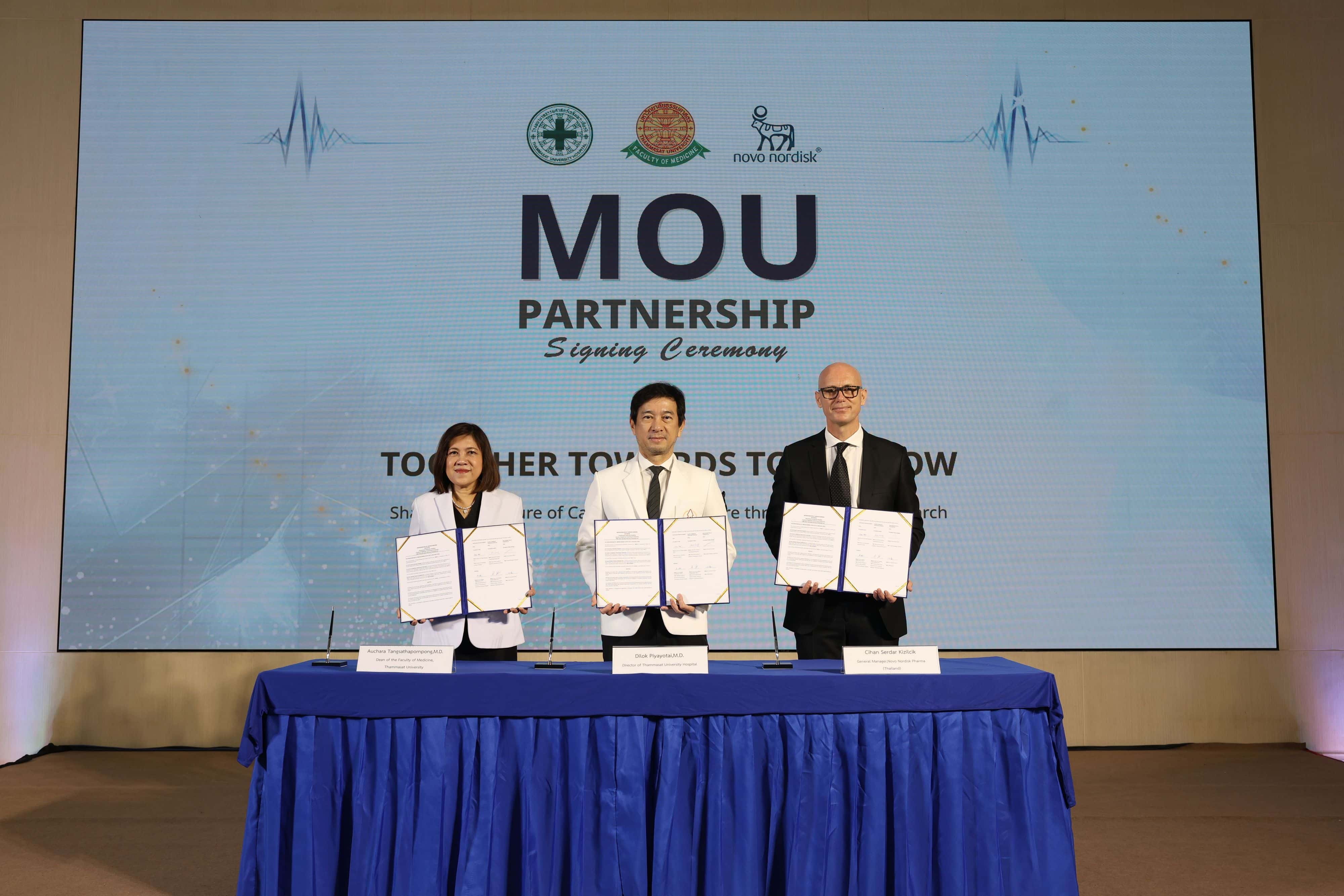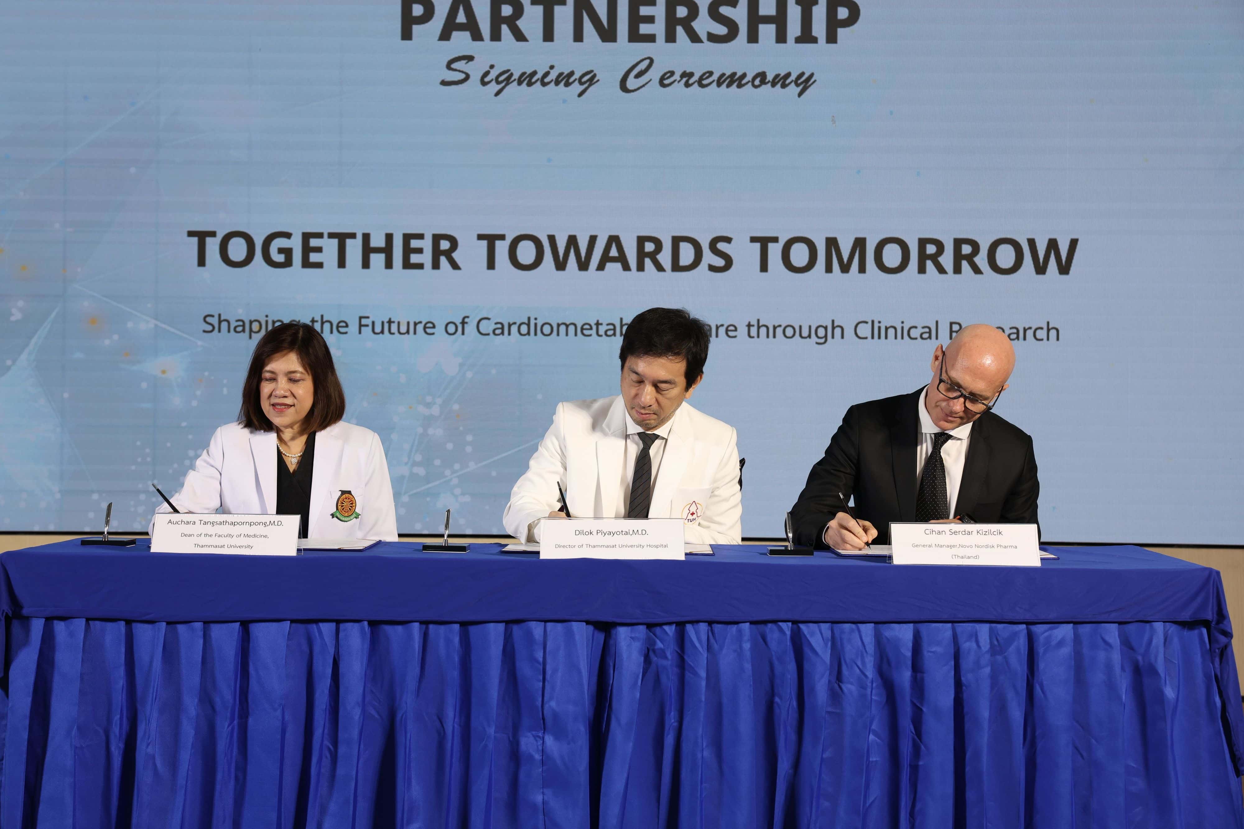 โรงพยาบาลธรรมศาสตร์เฉลิมพระเกียรติ คณะแพทยศาสตร์ มหาวิทยาลัยธรรมศาสตร์ และ บริษัท โนโว นอร์ดิสค์ ฟาร์มา (ประเทศไทย) จำกัด (“โนโว นอร์ดิสค์”) ได้ลงนามในบันทึกความเข้าใจ (MOU)เพื่อขยายขอบเขตงานวิจัยทางคลินิกภายในโรงพยาบาล โดยต่อยอดจากความสำเร็จของความร่วมมือเดิมที่พัฒนาการดูแลโรคอ้วนและโรคเบาหวานอย่างครบวงจรของโรงพยาบาลฯ บันทึกความตกลงฉบับนี้มีเป้าหมายหลักในการขับเคลื่อนการเปลี่ยนแปลงเชิงบวกในการบริหารจัดการและการรักษาโรคหัวใจ หลอดเลือด และโรคทางเมแทบอลิกในประเทศไทย