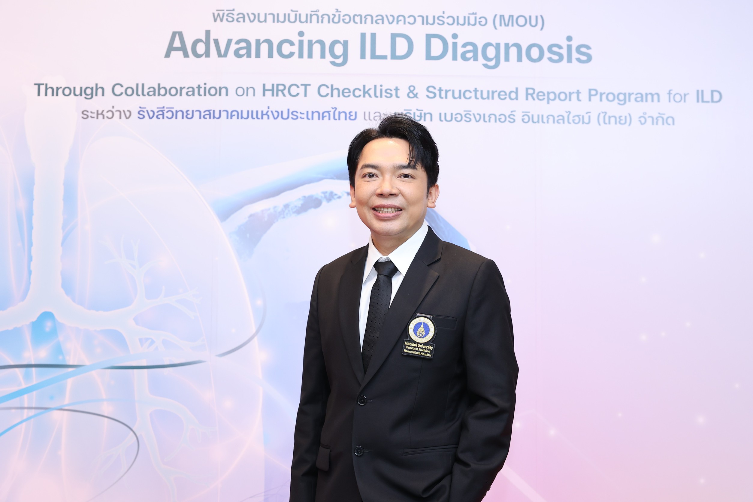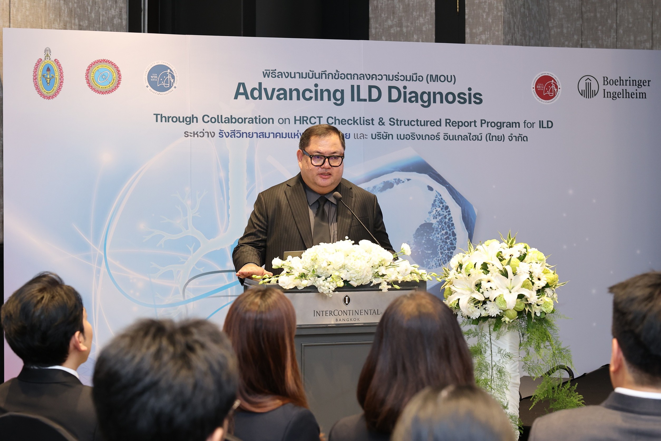 รังสีวิทยาสมาคมแห่งประเทศไทย และ บริษัท เบอริงเกอร์ อินเกลไฮม์ (ไทย) จำกัด เล็งเห็นถึงการยกระดับคุณภาพการวินิจฉัยโรคปอดอินเตอร์สติเชียล (Interstitial Lung Disease) หรือโรคไอแอลดี (ILD) ในประเทศไทยให้เป็นมาตรฐานเดียวกัน จึงได้ลงนาม MOU โครงการ “Advancing ILD Diagnosis” เพื่อร่วมกันพัฒนาเครื่องมือช่วยรายงานผล HRCT (High-Resolution CT หรือการตรวจเอกซเรย์คอมพิวเตอร์ความละเอียดสูงเพื่อวินิจฉัยโรคปอด) พร้อมผลักดันการใช้งานแนวทางการรายงานผล (HRCT Structured Report Template) เพื่อเพิ่มความแม่นยำและสร้างมาตรฐานการวินิจฉัยให้เป็นหนึ่งเดียวกันทั่วประเทศ ยังช่วยลดความคลาดเคลื่อนในการสื่อสารระหว่างแพทย์และรังสีแพทย์ พร้อมทั้งช่วยยกระดับการดูแลผู้ป่วยโรคไอแอลดี ในประเทศให้เข้าถึงการรักษาที่มีประสิทธิภาพอย่างเท่าเทียม