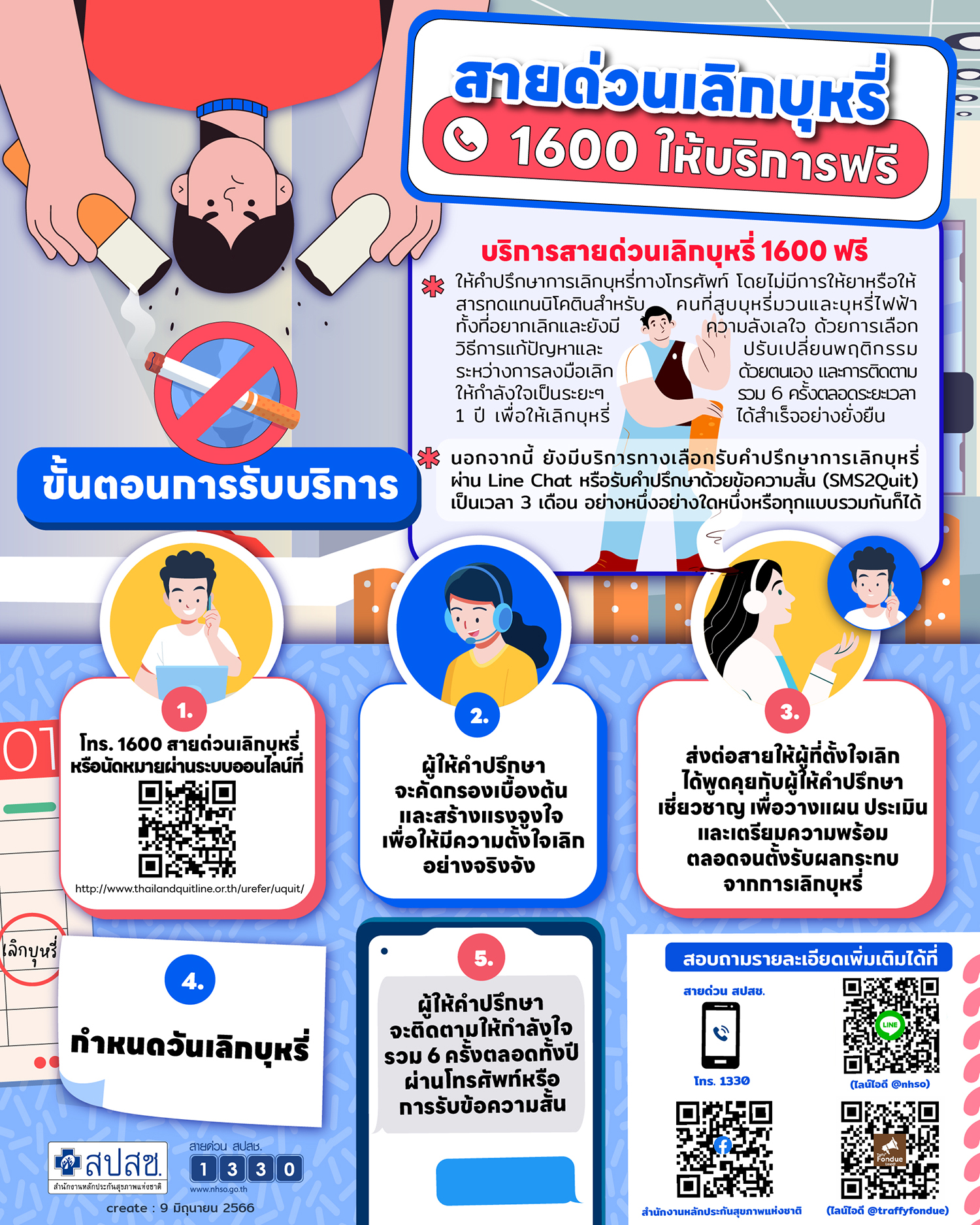 ทั้งนี้ ขอเชิญชวนผู้ที่ต้องการเลิกบุหรี่ หรือผู้ปกครองที่กังวลเกี่ยวกับการสูบบุหรี่และบุหรี่ไฟฟ้าของบุตรหลาน โทรมาขอคำปรึกษาได้ที่ สายด่วนเลิกบุหรี่ 1600 ให้บริการฟรี มีทีมผู้เชี่ยวชาญดูแลอย่างใกล้ชิด เพราะการเลิกบุหรี่เริ่มต้นได้ตั้งแต่วันนี้ และไม่จำเป็นต้องเดินคนเดียว
