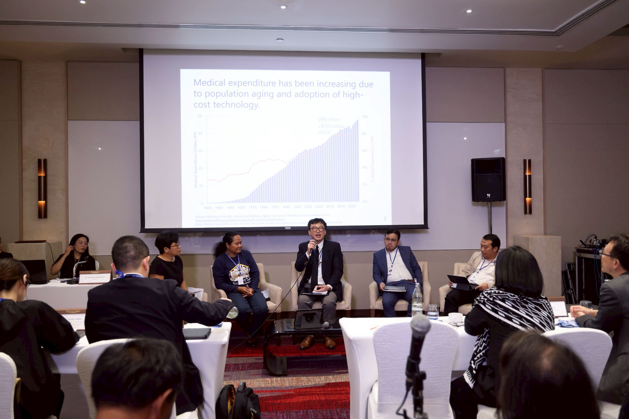 ในระหว่างการเสวนา ผู้แทนจากประเทศอื่น ๆ ยังได้กล่าวถึงสถานการณ์ของกลุ่มประชากรเปราะบางในประเทศของตนเอง และมาตรการช่วยเหลือด้านสุขภาพ อะยาโกะ มาสุ (Ayako Masu) หัวหน้าที่ปรึกษาโครงการขององค์การความร่วมมือระหว่างประเทศของญี่ปุ่น (JICA) ประจำ สปป.ลาว กล่าวว่า ระบบประกันสุขภาพของญี่ปุ่นแม้จะถูกมองว่าสมบูรณ์แบบ แต่ในความเป็นจริงยังไม่ครอบคลุมประชากรทุกกลุ่มอย่างแท้จริง ปัจจุบันมีประชากรร้อยละ 1.6 ที่ต้องพึ่งพาระบบสวัสดิการสาธารณะด้วยงบสนับสนุนจากรัฐบาล ซึ่งมีเกณฑ์คุณสมบัติที่เข้มงวด และผู้รับสิทธิมักเผชิญกับการตีตราทางสังคม ขณะที่ประชาชนอีกร้อยละ 24.5 อยู่ภายใต้ระบบประกันสุขภาพแห่งชาติ (National Health Insurance: NHI) ซึ่งใช้ระบบร่วมจ่ายในอัตรา 10–30% ทำให้ผู้มีรายได้น้อยจำนวนหนึ่งไม่สามารถรับภาระค่าใช้จ่ายได้ และตัดสินใจเลิกเข้ารับการรักษาในโรงพยาบาล