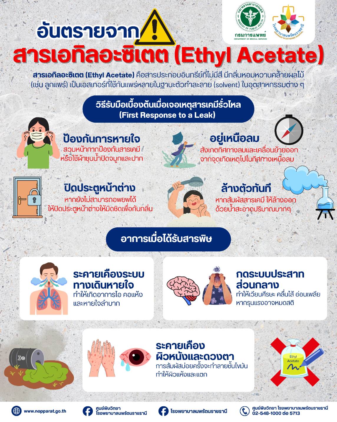 นายแพทย์ปิยวัฒน์ เลาวหุตานนท์ ผู้อำนวยการโรงพยาบาลนพรัตนราชธานี กล่าวเพิ่มเติม สารเอทิล อะซิเตต (Ethyl Acetate) เป็นของเหลวไวไฟที่ระเหยได้ง่าย ใช้เป็นตัวทำละลายในงานอุตสาหกรรม จัดเป็นสารที่มีความเป็นพิษต่ำ แต่สามารถเกิดผลกระทบต่อสุขภาพได้ เมื่อสูดดมเอาไอระเหยของสารที่มีความเข้มข้นสูงเข้าไปจะทำเกิดการระคายเคืองทางเดินหายใจโดยมีอาการ ไอ คอแห้ง และหายใจลำบาก การสูดดมในปริมาณมากจะกดระบบประสาทส่วนกลาง ทำให้เกิดอาการ อ่อนเพลีย เวียนศีรษะ มึนงง คลื่นไส้ และอาเจียน ในกรณีที่รุนแรงอาจทำให้หมดสติได้ นอกจากนี้มีผลทำให้เกิดการระคายเคืองต่อดวงตาและผิวหนัง การสัมผัสบ่อยจะทำให้เกิดการทำลายชั้นไขมันของผิวหนังทำให้ผิวแห้งและแตก ควรหลีกเลี่ยงการหายใจเอาไอระเหยของสารเข้าไป และย้ายไปยังที่ที่มีอากาศถ่ายเท หายใจสะดวก ถ้าสัมผัสผิวหนังเช็ดให้แห้งแล้วล้างผิวด้วยน้ำ หากเข้าตาให้ล้างออกด้วยน้ำสะอาดหลายครั้ง ผู้ได้รับสัมผัสหากรู้สึกไม่สบายให้รีบพบแพทย์ หรือโทรศัพท์สอบถามข้อมูลเพิ่มเติมที่ 02-517-1000 ต่อ 5713 ศูนย์พิษวิทยา โรงพยาบาลนพรัตนราชธานี