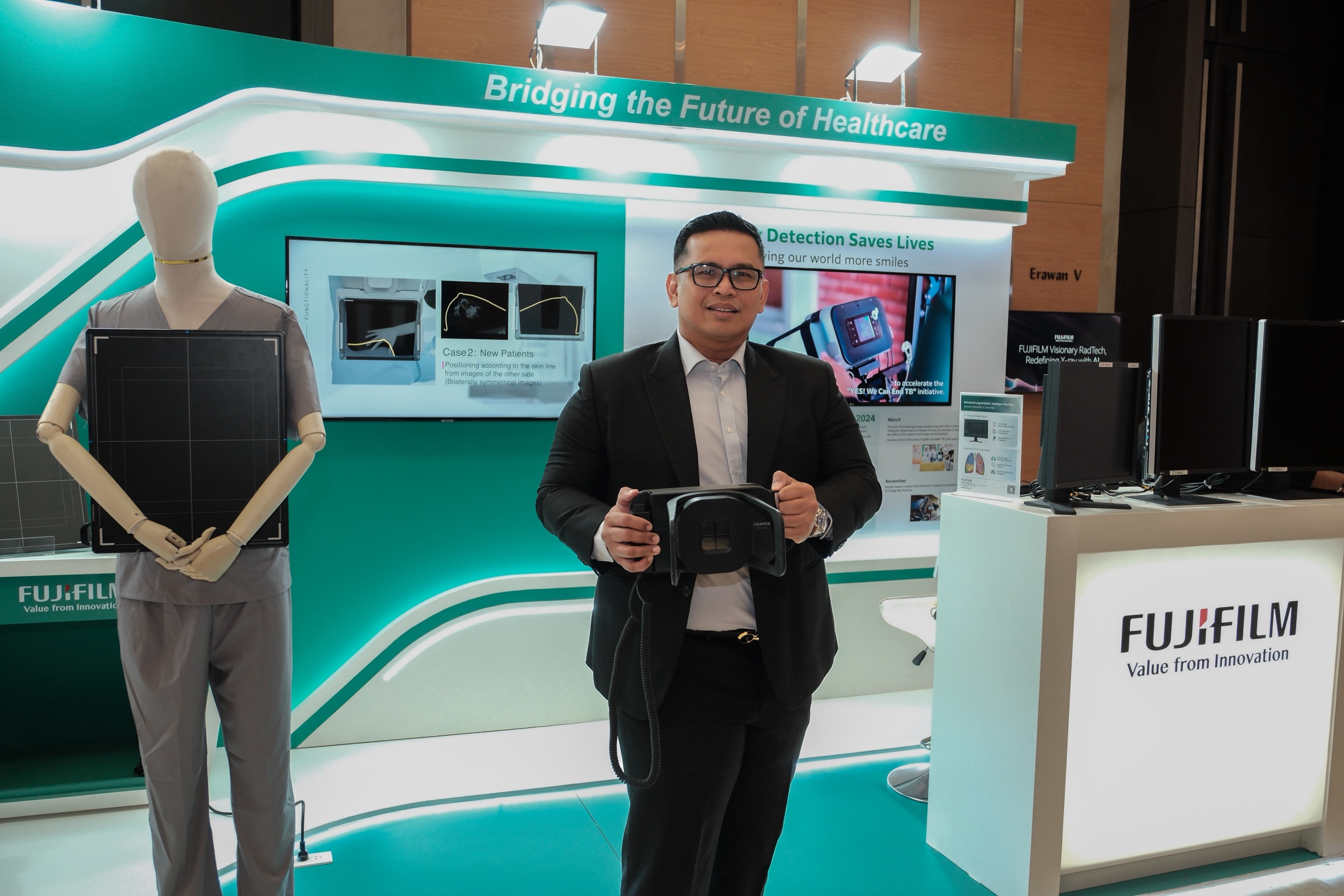 ในโอกาสนี้ ฟูจิฟิล์มยังได้เปิดตัวผลิตภัณฑ์เรือธงสองรุ่นใหม่ในตลาดประเทศไทยเป็นครั้งแรก ได้แก่ FDR Visionary Suite และ FDR Go iQ โดย นายรัชกฤช เต็มบุญศักดิ์ หัวหน้าหน่วยธุรกิจทางการแพทย์และสุขภาพ ดูแลในส่วนเครื่องเอกซเรย์และไอที บริษัท ฟูจิฟิล์ม (ประเทศไทย) จำกัด เผยว่า “FDR Visionary Suite คือระบบเอกซเรย์ดิจิทัลระดับไฮเอนด์ที่ให้ภาพคมชัดด้วยเทคโนโลยีเฉพาะ Irradiated Side Sampling (ISS) ของฟูจิฟิล์ม โดยรุ่นอัปเกรดใหม่มาพร้อมฟีเจอร์กล้อง Live view ที่ช่วยยกระดับการดูแลผู้ป่วยและลดความเสี่ยงในการตรวจ ระบบ Motion Detection และ Last Image View จากฟีดถ่ายทอดสดช่วยลดการถ่ายภาพซ้ำ ขณะที่ระบบจัดท่าอัตโนมัติที่ขับเคลื่อนด้วย AI สำหรับการถ่ายภาพทรวงอก ช่วยเพิ่มความแม่นยำและประสิทธิภาพสำหรับแผนกรังสีวิทยาที่มีผู้ป่วยเป็นจำนวนมาก เทคโนโลยีนี้เข้ามาช่วยลดการถ่ายภาพซ้ำ ย่นระยะเวลาการตรวจ และสร้างประสบการณ์ที่ดีขึ้นสำหรับผู้ป่วยที่อาจกำลังเจ็บปวดหรือรู้สึกกังวล”
