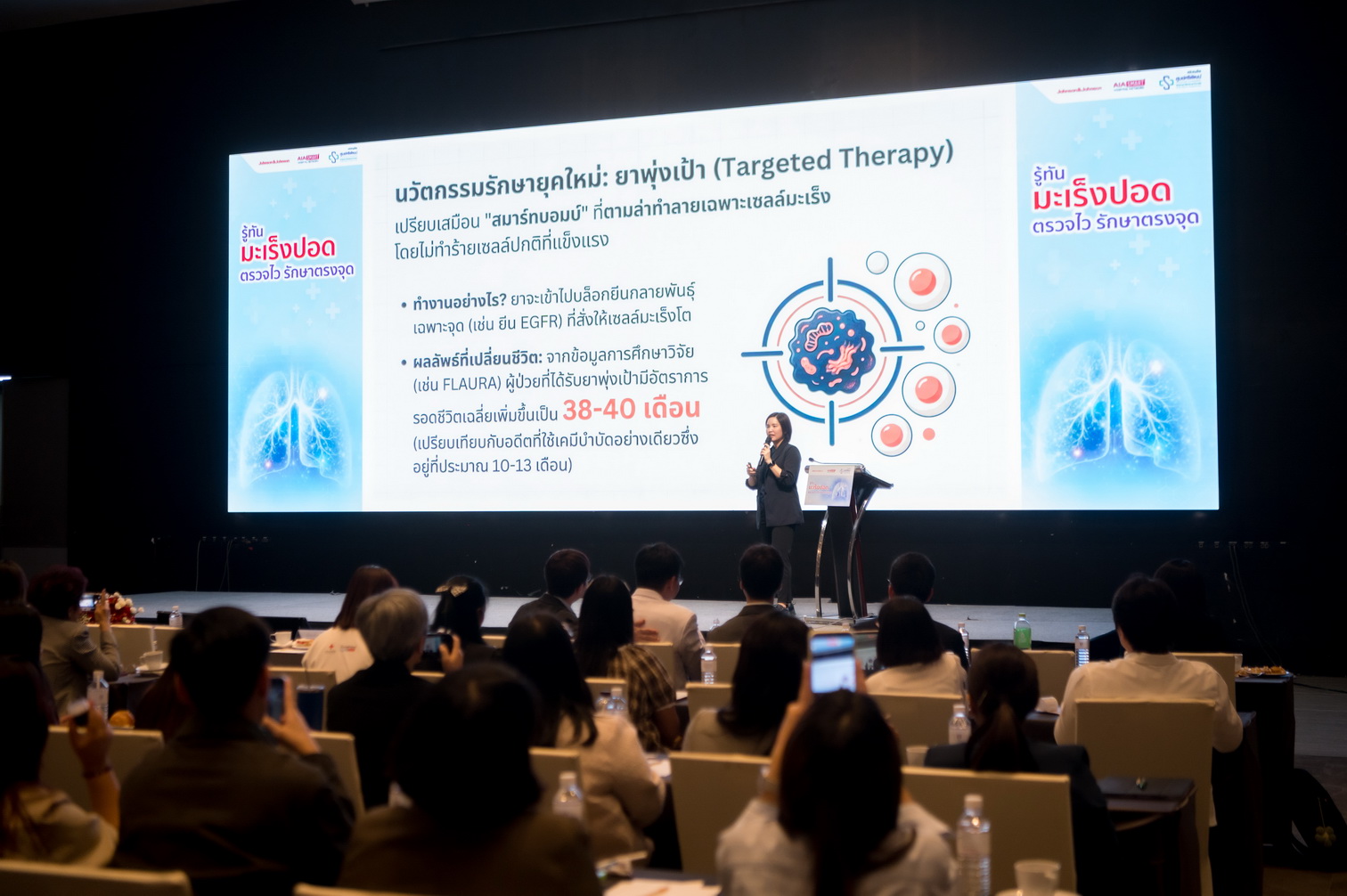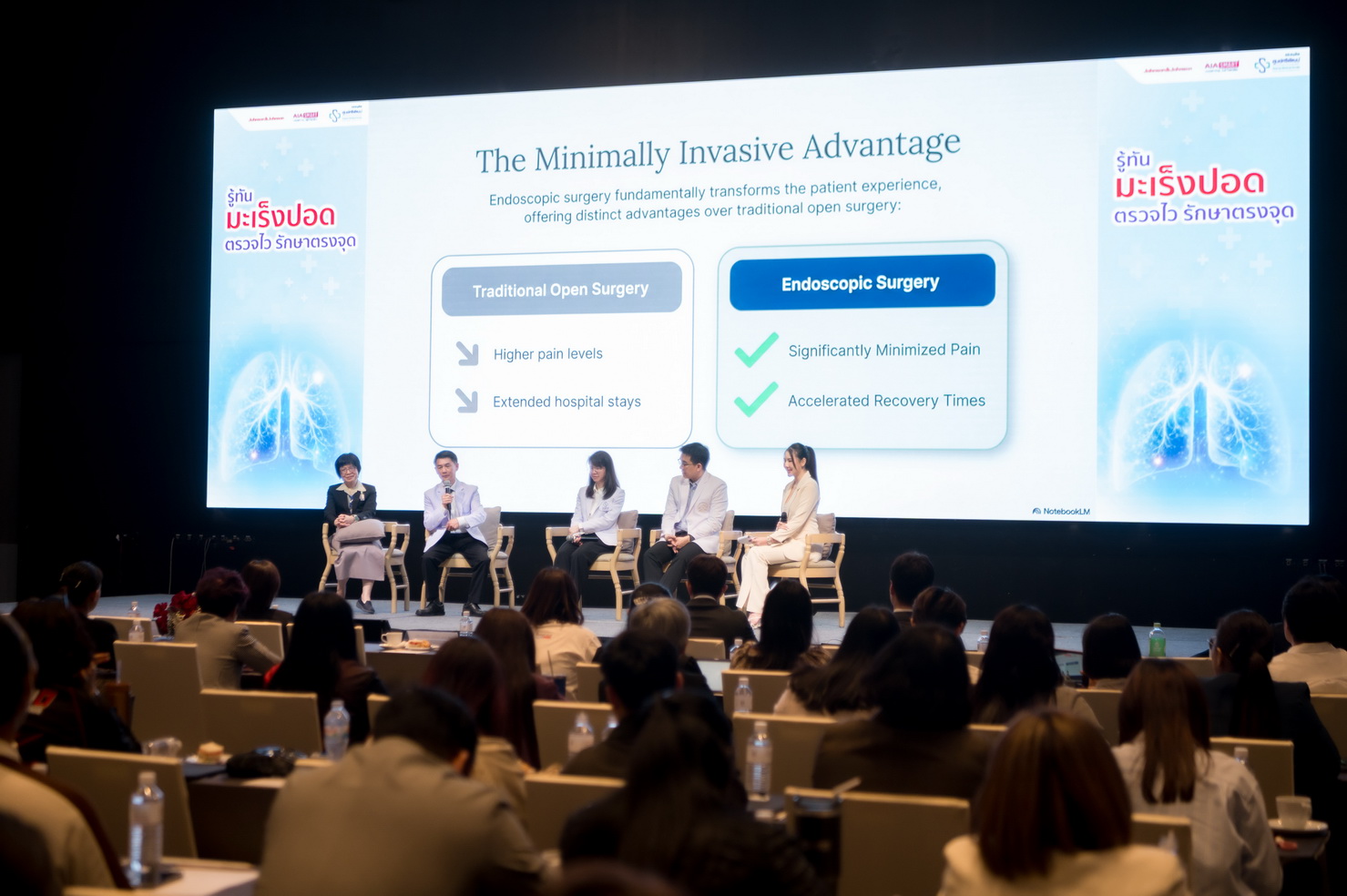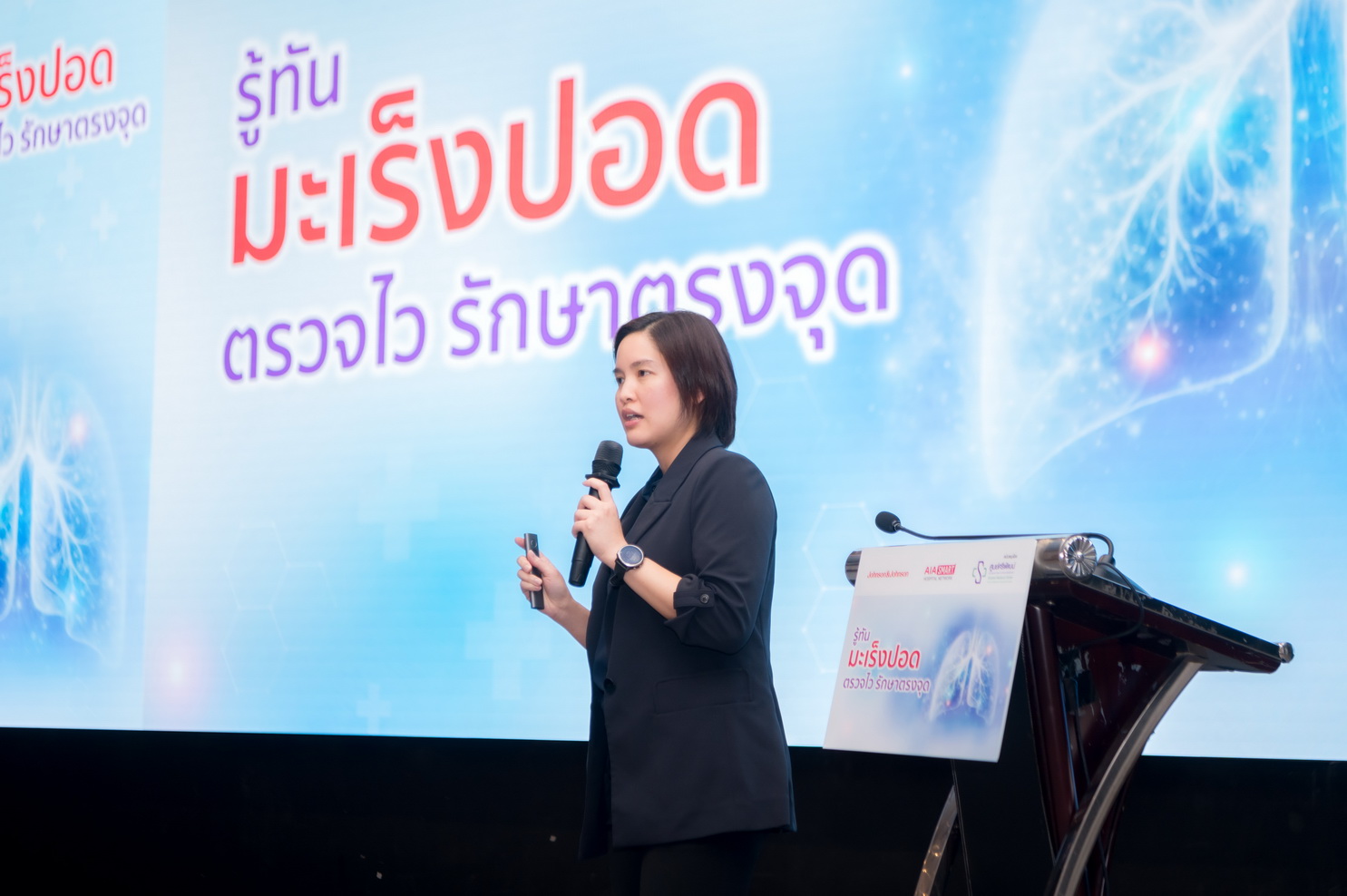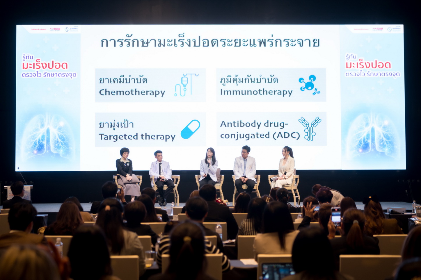 เพื่อรับมือกับวิกฤตดังกล่าว กลุ่มบริษัท จอห์นสัน แอนด์ จอห์นสัน ประเทศไทย (จำกัด) ร่วมกับ เอไอเอ ประเทศไทย (AIA) โดยได้รับการสนับสนุนจาก ศูนย์ศรีพัฒน์ คณะแพทยศาสตร์ มหาวิทยาลัยเชียงใหม่ ซึ่งนับเป็นศูนย์กลางทางการรักษาที่สำคัญในเขตภาคเหนือ เดินหน้าจัดงานเสวนา “รู้ทันมะเร็งปอด ตรวจไว รักษาตรงจุด” เพื่อส่งเสริมความรู้แก่ประชาชนเกี่ยวกับโรคมะเร็งปอด ตั้งแต่การป้องกัน การคัดกรองที่ถูกวิธี และทางเลือกการรักษายุคใหม่ โดยเน้นการดูแลแบบบูรณาการและยึดผู้ป่วยเป็นศูนย์กลาง พร้อมชูความสำคัญของนวัตกรรมทางเทคโนโลยี ตั้งแต่การเอกซเรย์ทรวงอกด้วยเทคโนโลยี AI และการตรวจเอกซเรย์คอมพิวเตอร์ชนิดรังสีต่ำ (Low Dose CT) ซึ่งหากพบรอยโรคในระยะแรก ผู้ป่วยสามารถเข้ารับการรักษาด้วยการผ่าตัดผ่านกล้อง (MIS) ที่มีจุดเด่นคือ แผลเล็ก บาดเจ็บน้อย และฟื้นตัวไว รวมทั้งมีโอกาสหายสูง นอกจากนี้ยังเน้นความสำคัญของการรักษาด้วยยามุ่งเป้าที่สามารถช่วยเพิ่มอัตราการรอดชีวิตและช่วยให้ผู้ป่วยมีคุณภาพชีวิตที่ดีได้ หากโรคเข้าสู่ระยะลุกลาม โดยเน้นย้ำว่า การตรวจพบไวและรักษาตรงจุด จะช่วยเพิ่มโอกาสการหายขาดจากโรคมะเร็งปอดได้สูง