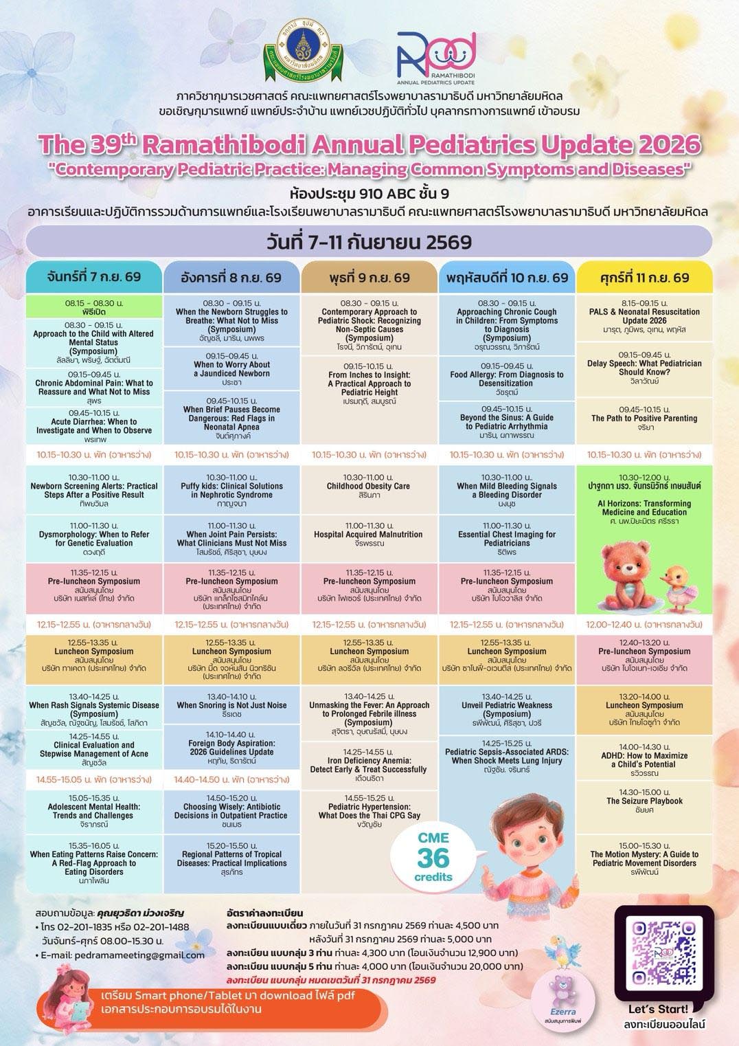 ภาควิชากุมารเวชศาสตร์ คณะแพทยศาสตร์โรงพยาบาลรามาธิบดี มหาวิทยาลัยมหิดล จัดการประชุมวิชาการ The 39th Ramathibodi Annual Pediatrics Update 2026 “ Contemporary Pediatric Prectice : Managing Common Symptoms and Diaeases ” วันที่ 7-11 กันยายน 2569 ณ ห้องประชุม 910 ABC ชั้น 9 อาคารเรียนและปฏิบัติการรวมด้านการแพทย์และโรงพยาบาลรามาธิบดี คณะแพทยศาสตร์โรงพยาบาลรามาธิบดี มหาวิทยาลัยมหิดล