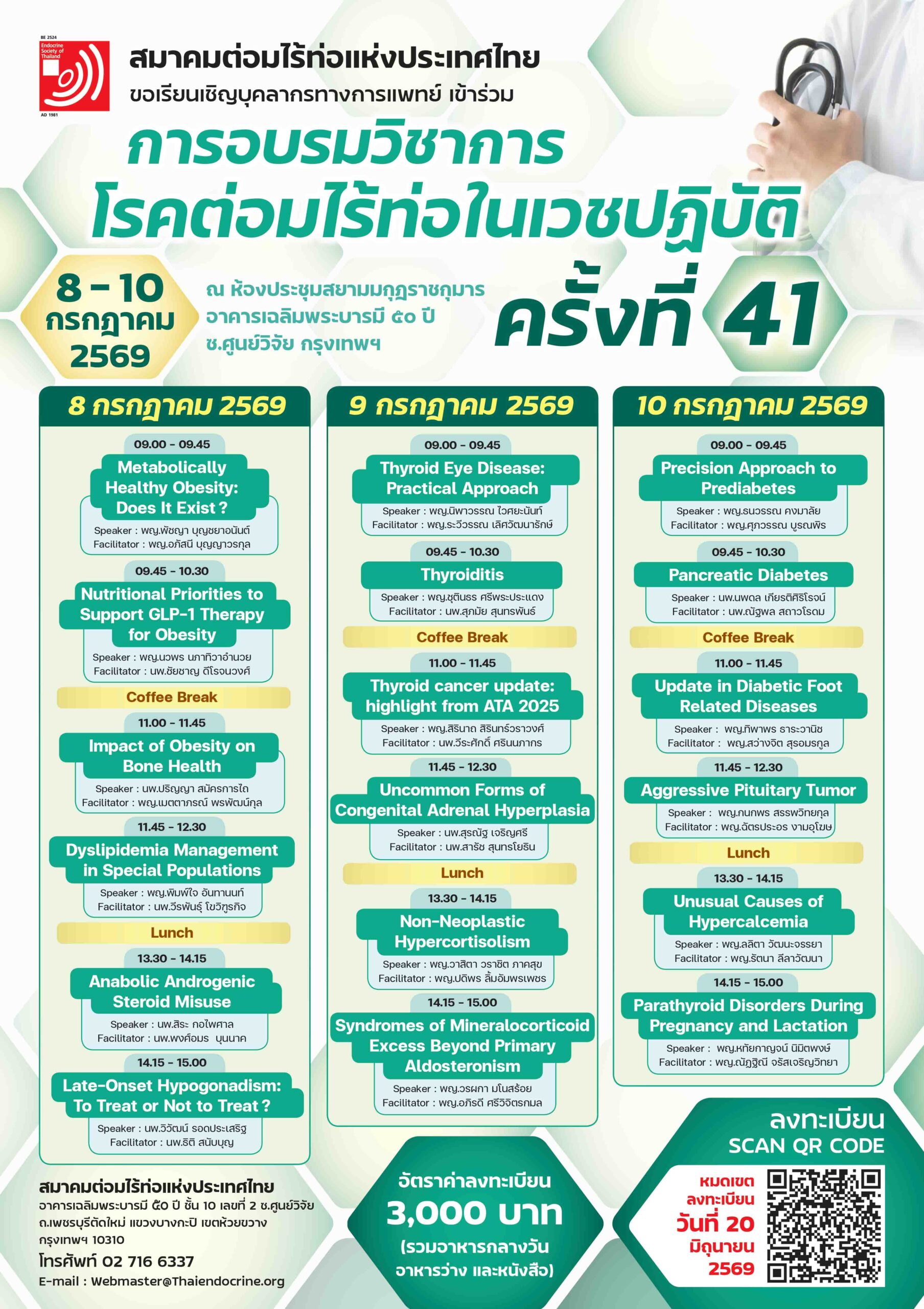 สมาคมต่อมไร้ท่อแห่งประเทศไทย จัดการอบรมวิชาการโรคต่อมไร้ท่อในเวชปฏิบัติ ครั้งที่ 41 วันที่ 8-10 กรกฎาคม พ.ศ. 2569 ณ ห้องประชุมสยามมกุฎราชกุมาร อาคารเฉลิมพระบารมี ๕๐ ปี ซ.ศูนย์วิจัย กรุงเทพฯ
